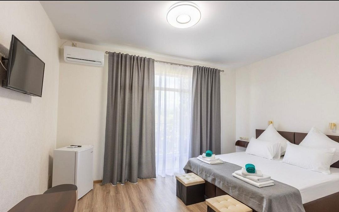 В номере двуспальная кровать, собственный душ и санузел, телевизор, холодильник.