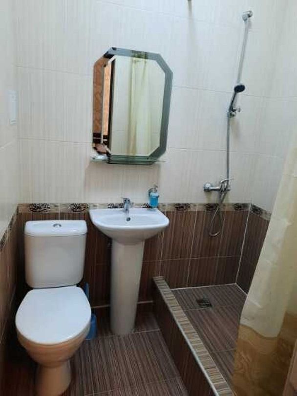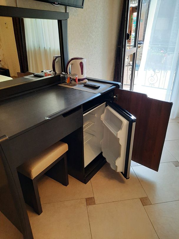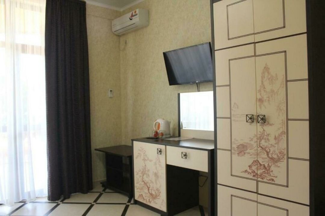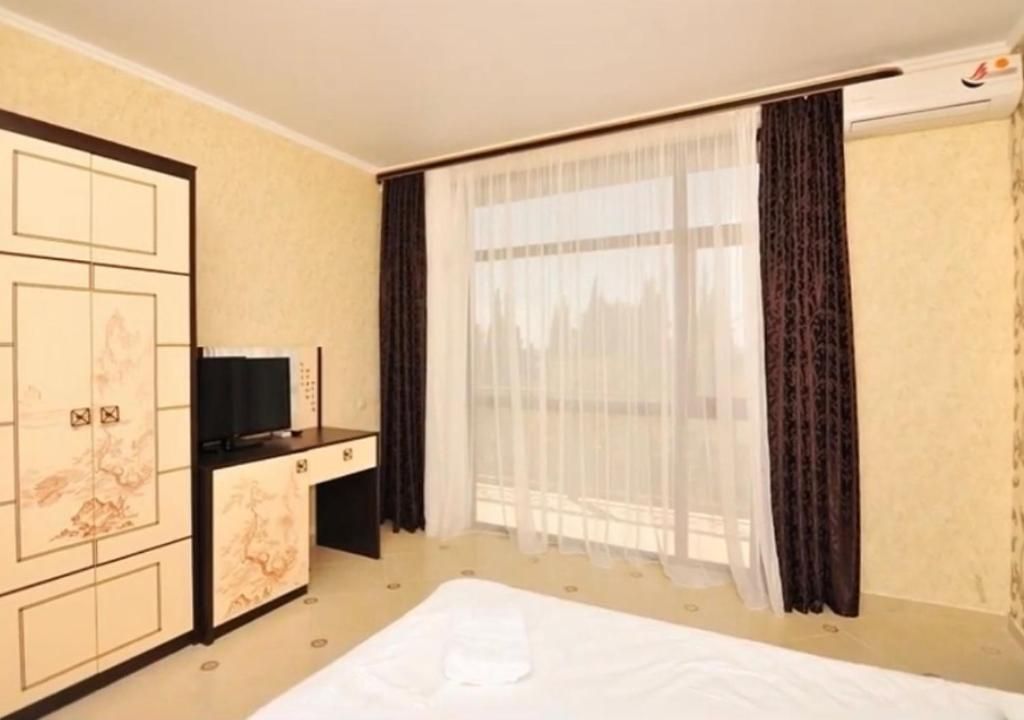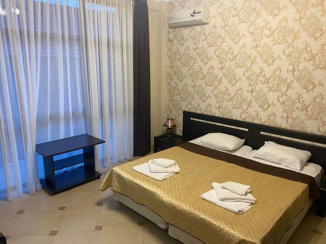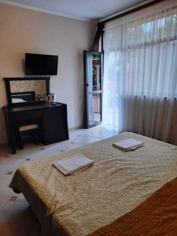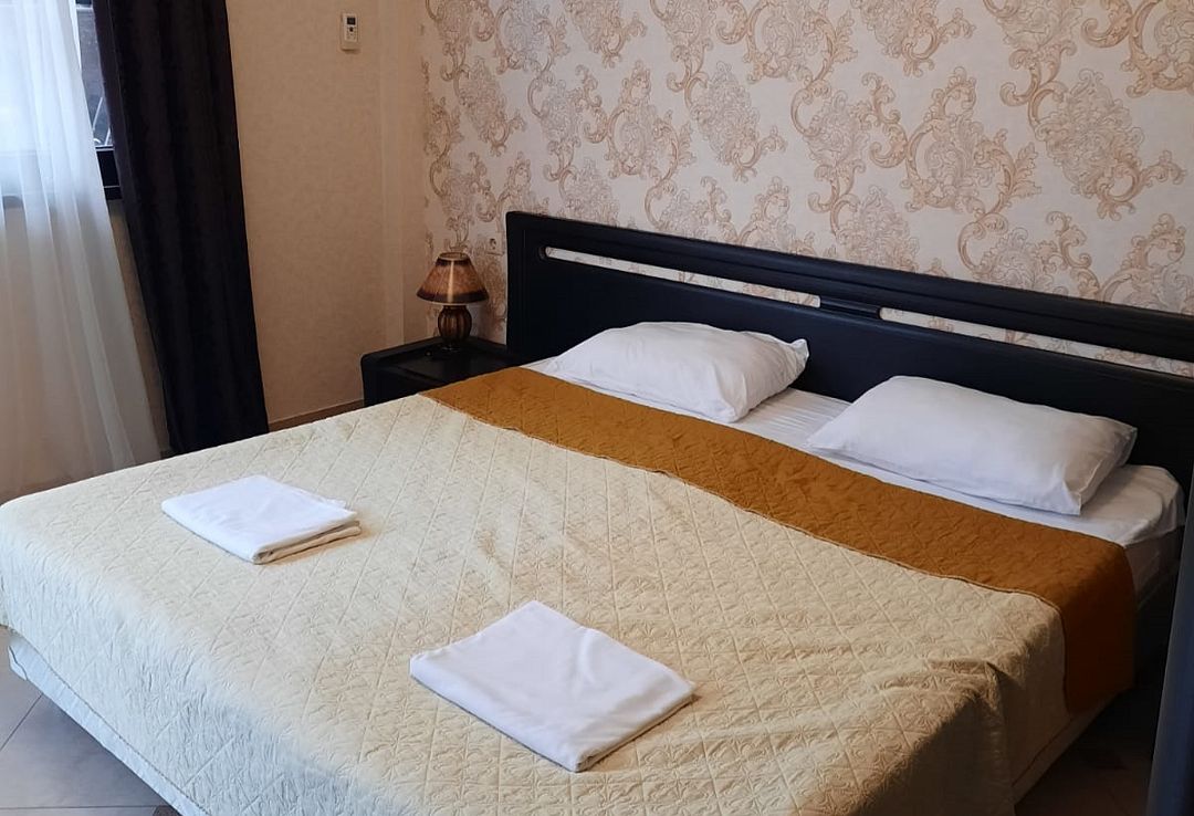 Просторный и уютный номер, оформленный в спокойных тёплых тонах — отличный вариант для комфортного отдыха вдвоём. Современная мебель, аккуратный интерьер и продуманная планировка создают атмосферу уюта и спокойствия. В номере: • двуспальная кровать с удобным матрасом • прикроватные тумбочки и светильники • шкаф для одежды • стол / туалетный столик • телевизор с плоским экраном • кондиционер • холодильник • электрический чайник • Wi-Fi Собственный санузел: • душ • туалет • раковина с зеркалом • полотенца и туалетные принадлежности Номер светлый, с большими окнами, подходит для размещения пары, ценящей комфорт, чистоту и спокойную обстановку рядом с морем.Услуги и удобства