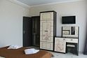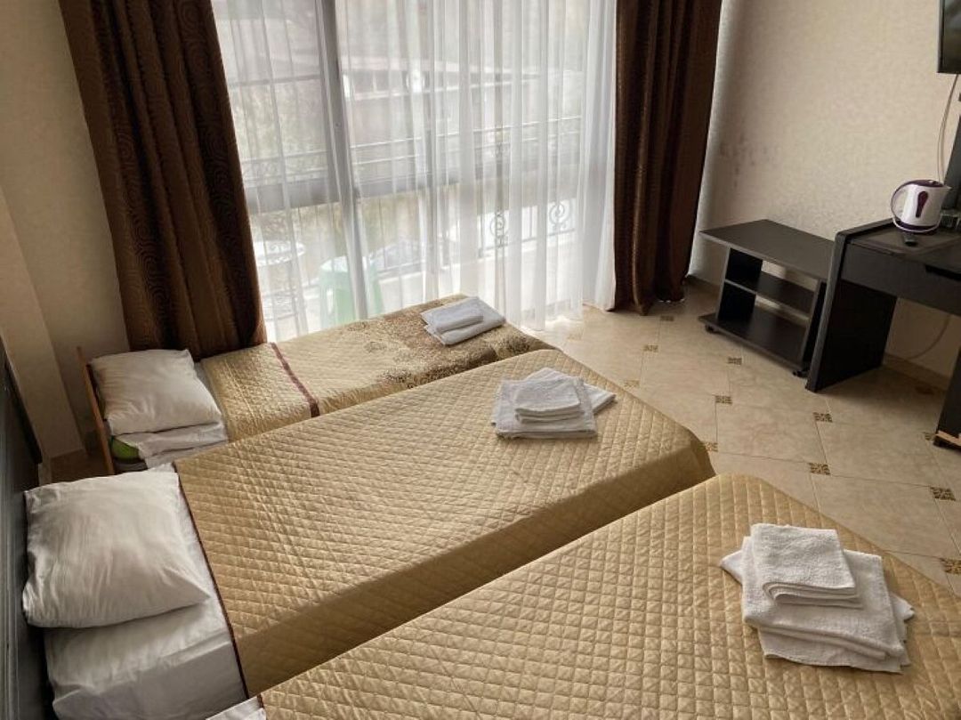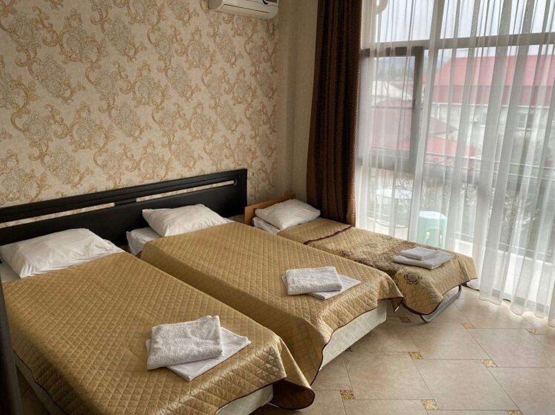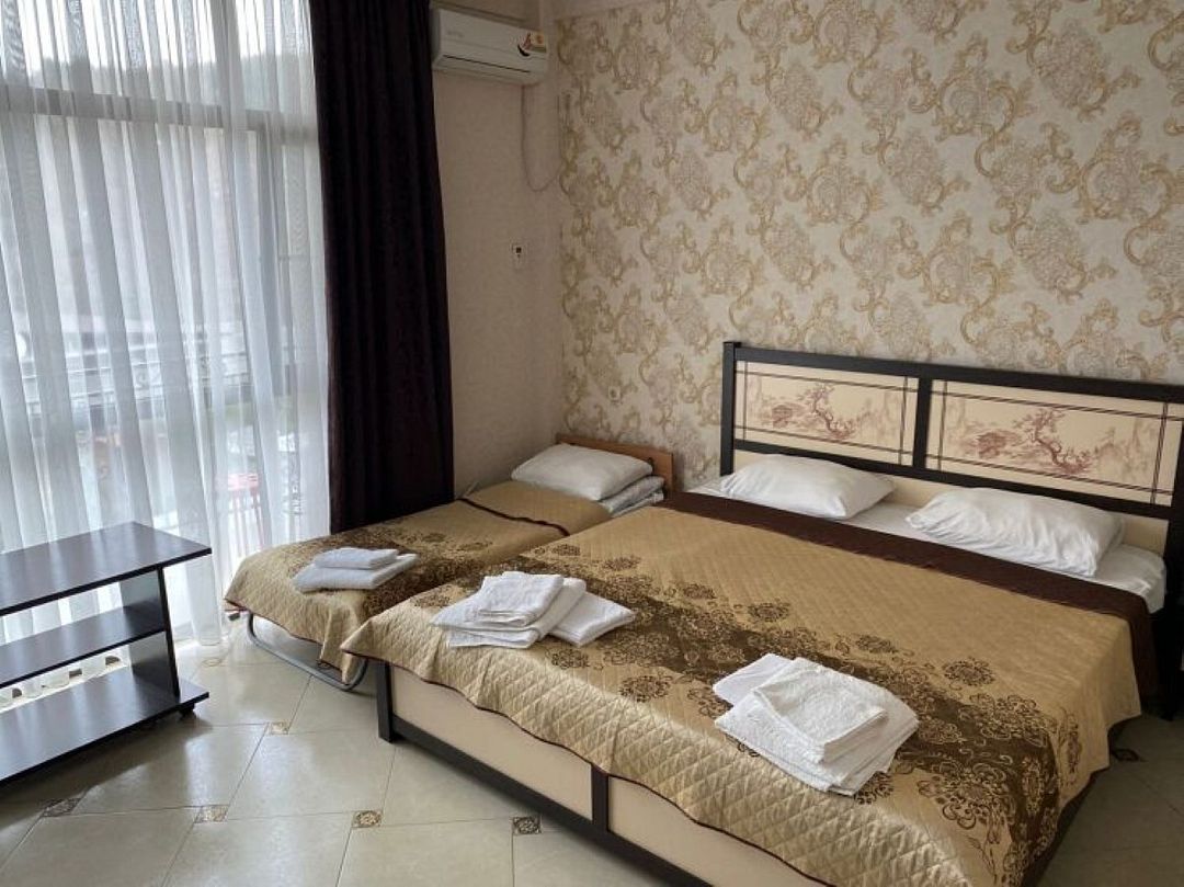 Уютный и функциональный номер, идеально подходящий для размещения двух гостей с возможностью дополнительного размещения (ребёнок или взрослый). Номер оформлен в спокойных тёплых тонах, светлый и просторный, с современной мебелью и продуманной планировкой. Размещение: • две односпальные кровати или двуспальная кровать • дополнительное место — еврораскладушка В номере: • шкаф для одежды • прикроватные тумбочки и светильники • стол / туалетный столик • телевизор с плоским экраном • кондиционер • холодильник • электрический чайник • Wi-Fi Собственный санузел: • душ • туалет • раковина с зеркалом • полотенца и туалетные принадлежности Номер отлично подойдёт для семьи с ребёнком или компании из трёх человек, сочетая комфорт, удобство и домашнюю атмосферу для отдыха у моря.Услуги и удобства