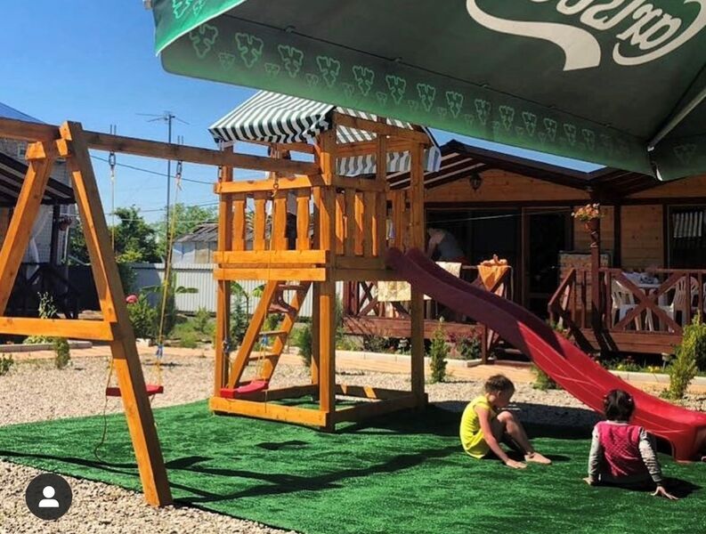 На территории имеется общая кухня, зона для барбекю с мангалом, каркасный бассейн, для детей предусмотрена игровая площадка с батутом и качелями.