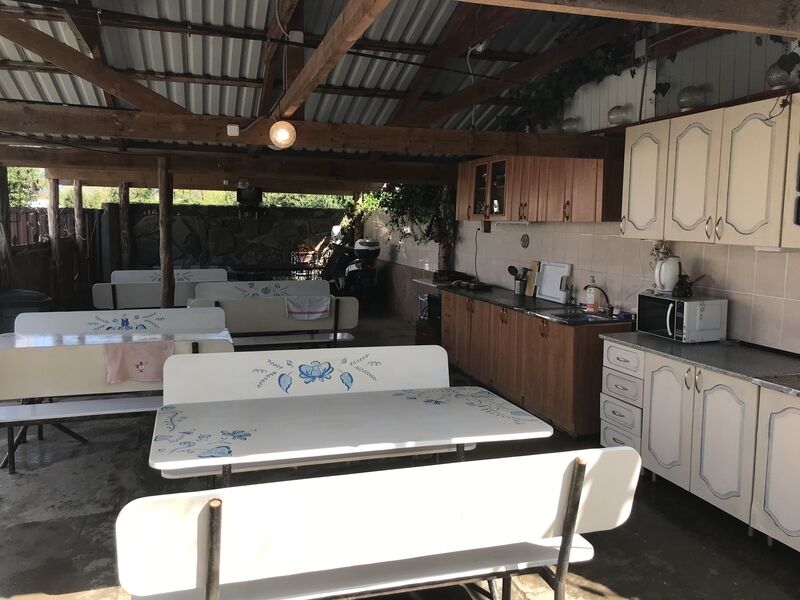 общая кухня (летняя, с мангалом, холодильником, плитой и посудой)