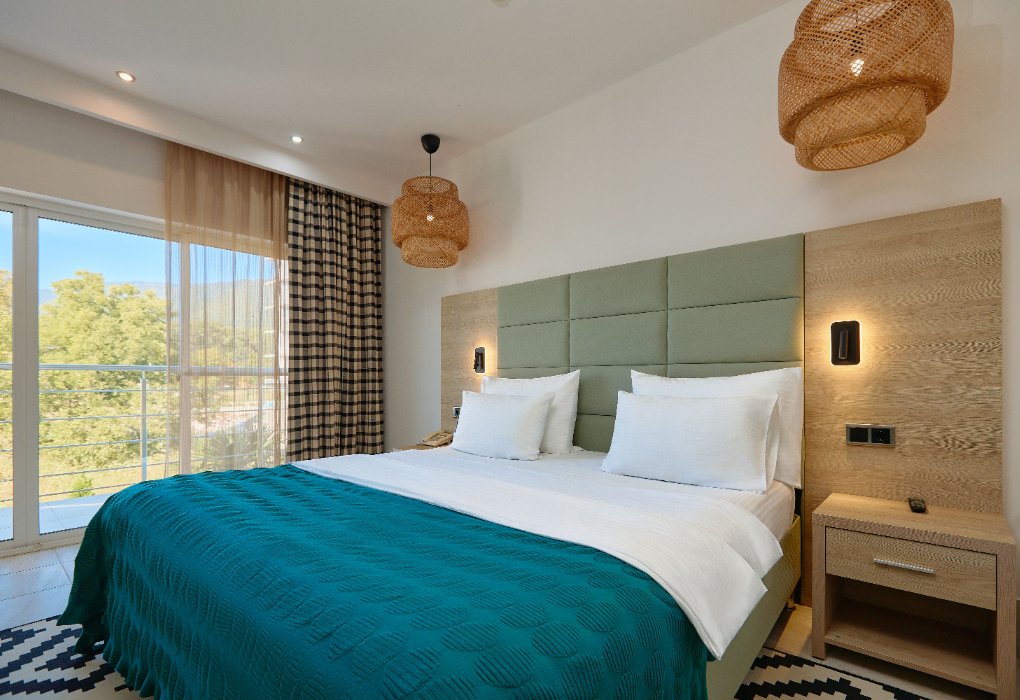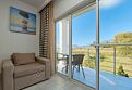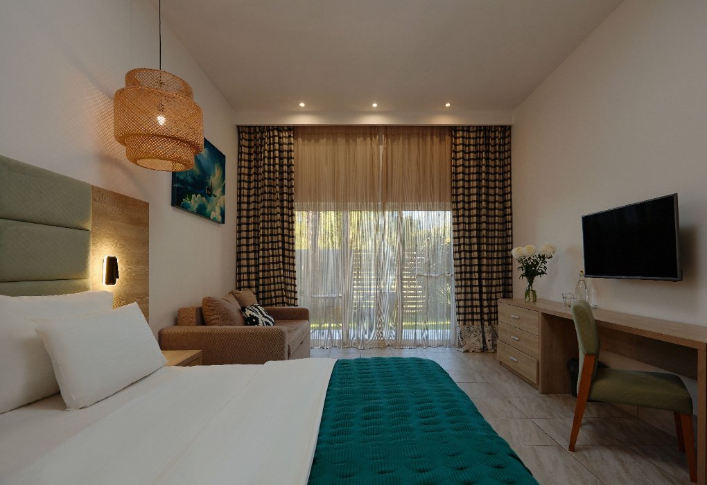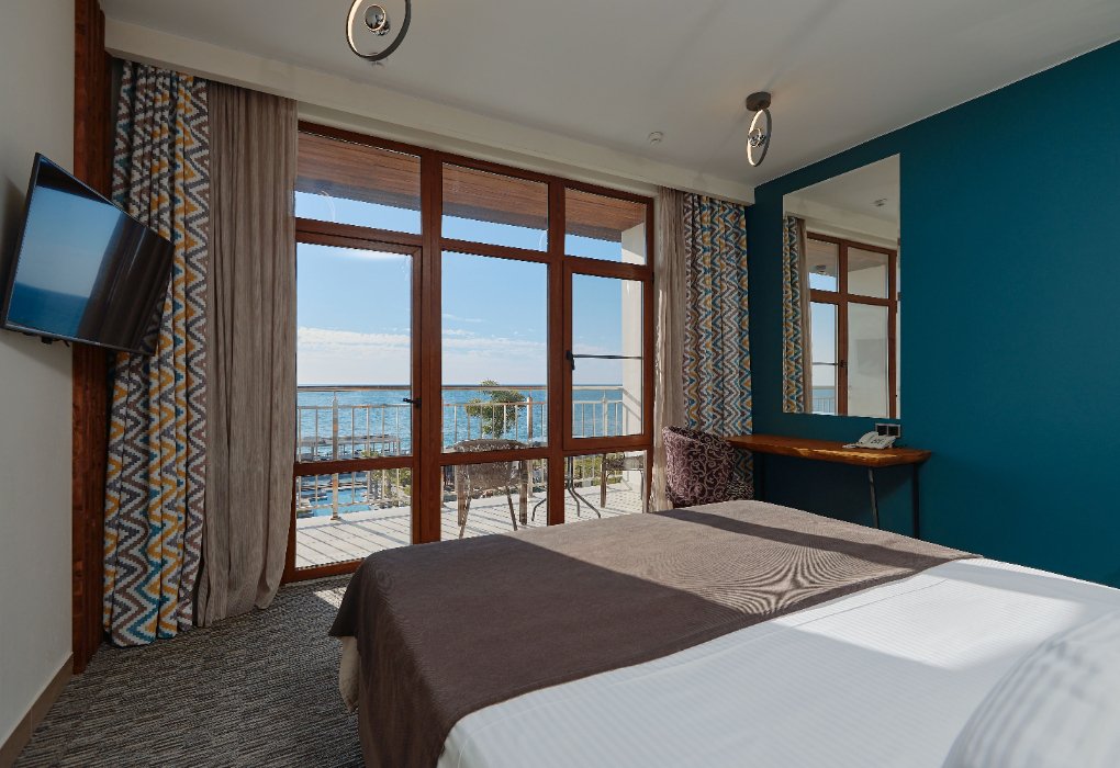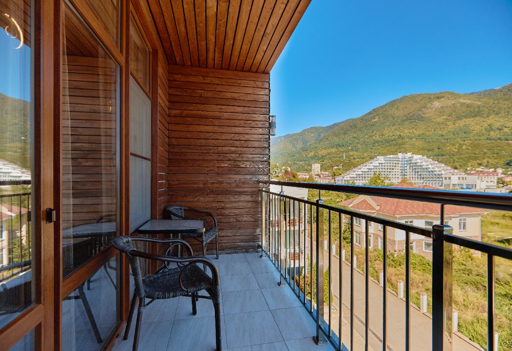 боковой вид на море и на горы; рядом ведётся строительство нового объектаВ гостиничном номере