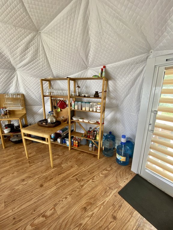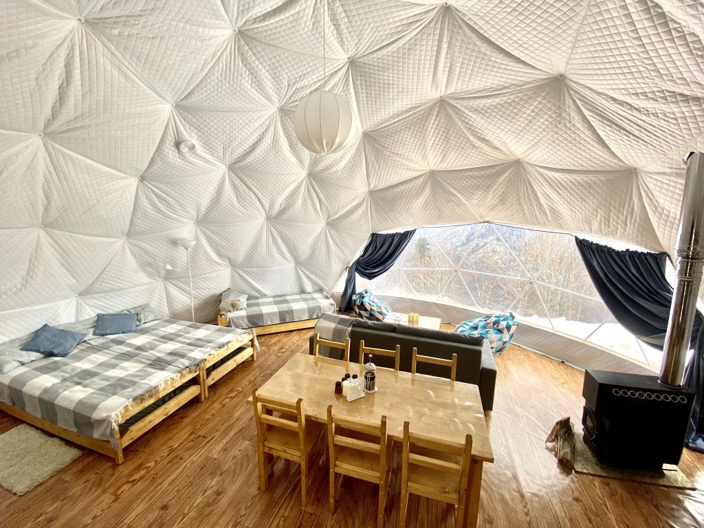 Глэмпинг состоит из домов-сфер, рассчитанных до 6 человек. В сфере есть спальная и кухонная зона, печь на дровах и невероятный панорамный вид на горы, море и облака.