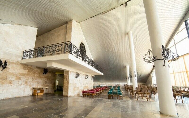 В пристройке к жилому корпусу находится столовая комплекса. В обеденном зале располагаются деревянные столы и стулья, за которыми могут одновременно разместиться все отдыхающие пансионата.