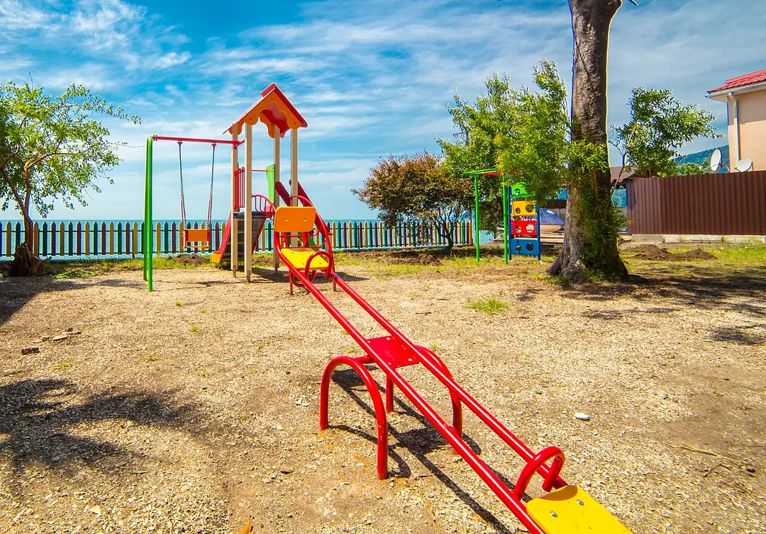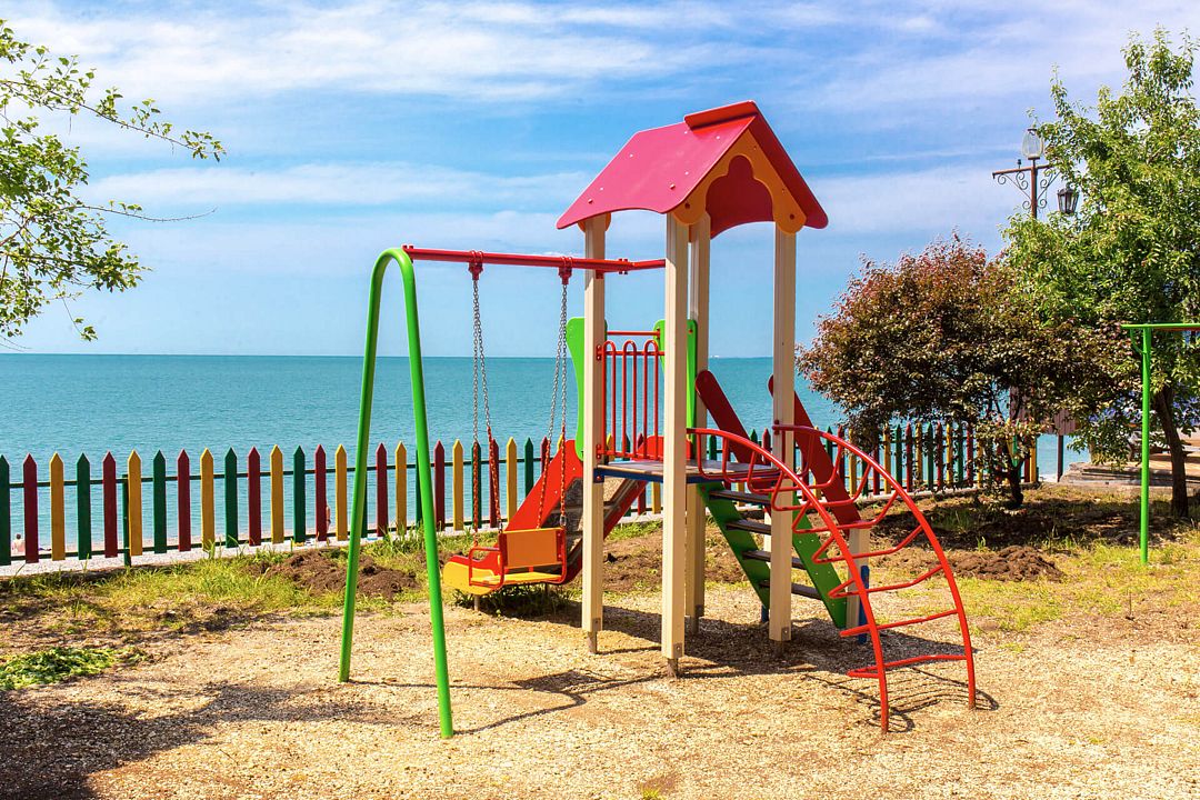У пляжа находится детская площадка, огражденная забором, где дети могут весело проводить время под присмотром родителей. С площадки открывается потрясающий вид на море, создавая идеальные условия для отдыха всей семьей.