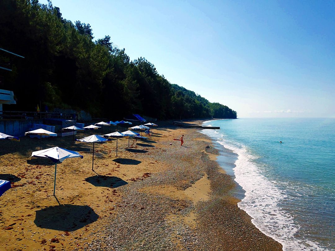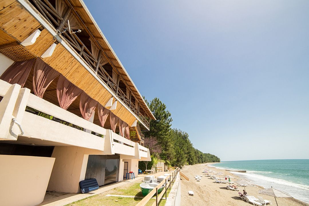 Тип пляжа: песчано-галечныйПансионат «Мюссера» расположен на самом берегу Черного моря и имеет собственный песчано-галечный пляж более 1200 метров. Пляж оснащен зонтиками, шезлонгами и навесом для шезлонгов, раздевалками, чистой пресной водой, туалетами и душем.