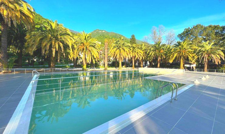 Тип бассейна: открытый бассейнВода в бассейне: подогреваемый бассейнРядом с бассейном: шезлонги, зонтикиТемпература в бассейне: 25 °CПлощадь: 213 м²Время работы: от 09:00 до 20:00Глубина (диапазон): от 70 до 160 смБассейн с пресной водой и выделенной детской зоной для плавания работает с 1 мая по 31 октября включительно. У бассейна оборудована зона отдыха с местами для загара и столиками. В вечернее время включается светодиодная подсветка воды. Детская зона площадью 36 кв.м, глубиной до 70 см.