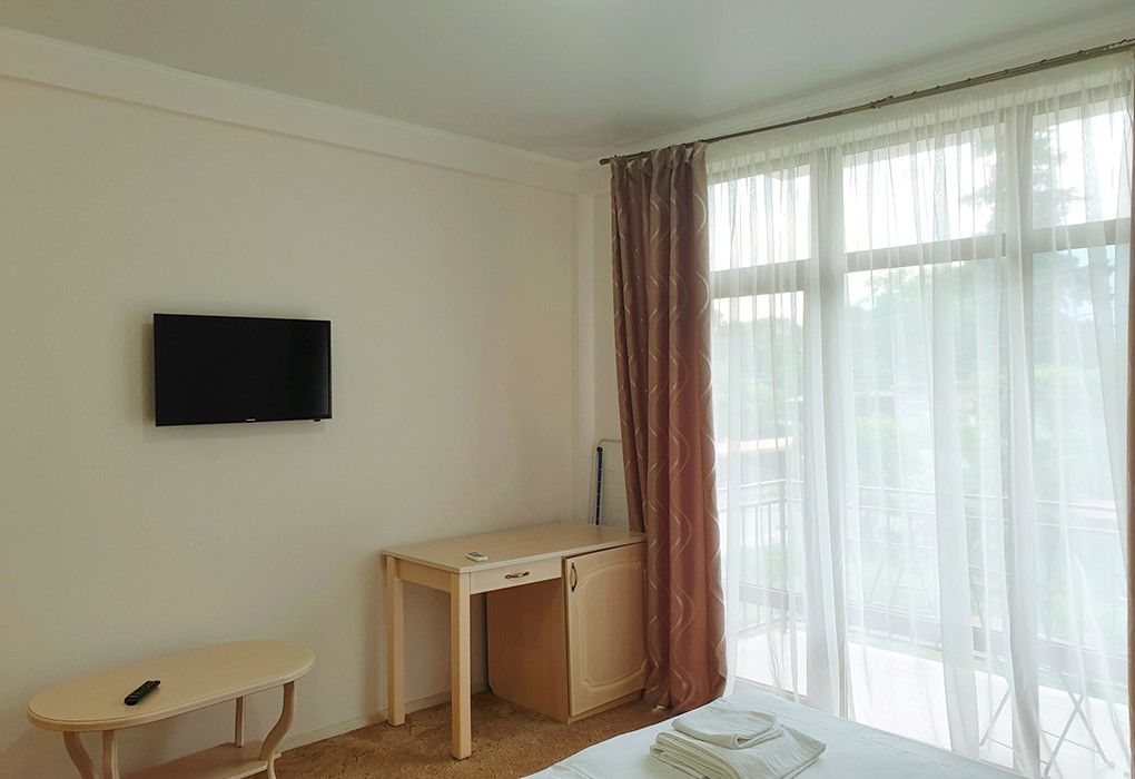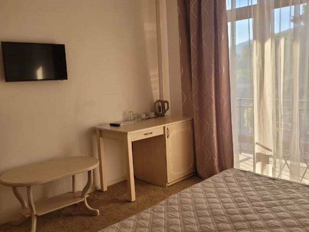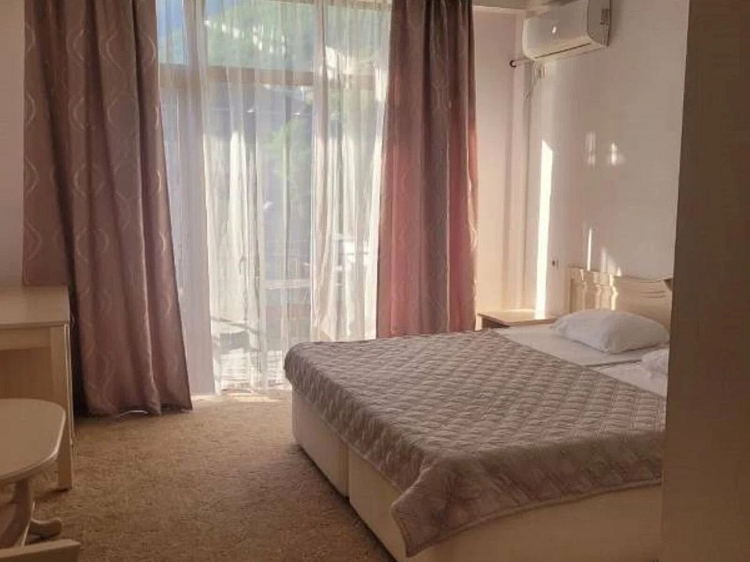 Светлый и просторный двухместный номер, идеально подходящий для комфортного отдыха вдвоём. В номере — удобная двуспальная кровать с качественным матрасом, чистое постельное бельё и полотенца, создающие ощущение уюта и домашнего комфорта. Номер оборудован кондиционером, вместительным шкафом для хранения вещей, прикроватными тумбами и обеденной зоной. Большие окна наполняют комнату естественным светом. Собственный балкон с мебелью — отличное место для утреннего кофе или вечернего отдыха на свежем воздухе. В распоряжении гостей отдельная ванная комната с душем, раковиной и туалетом. Номер подойдёт как для спокойного отдыха, так и для проживания на несколько дней с полным комфортом.Услуги и удобства