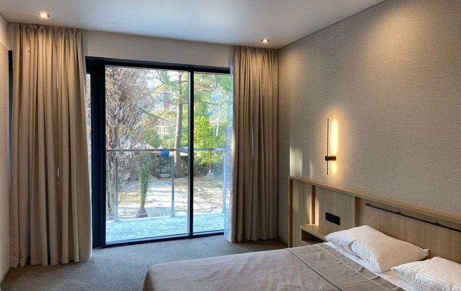 Отель располагается в 40 км от международного аэропорта «Сочи» и железнодорожного вокзала «Адлер». А до берега Черного моря всего 50 метров.
