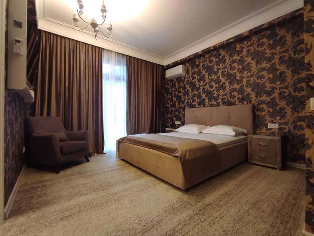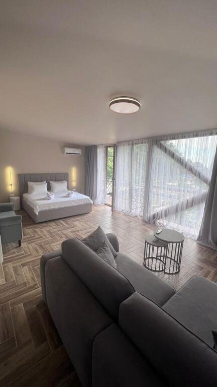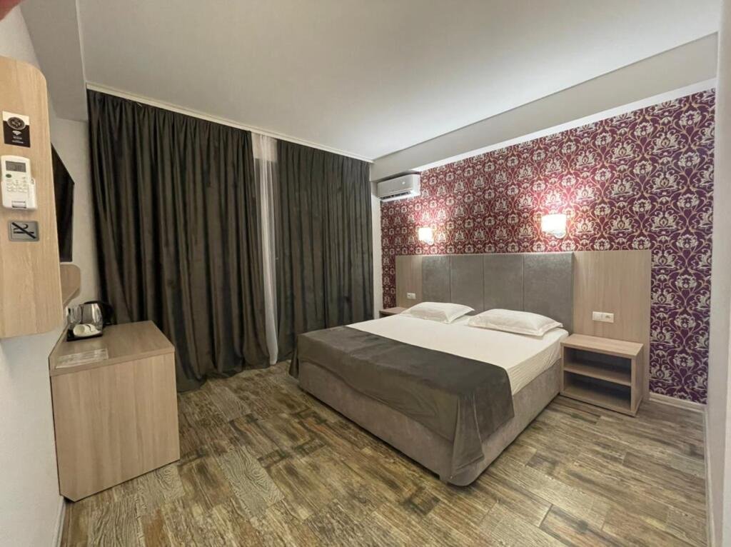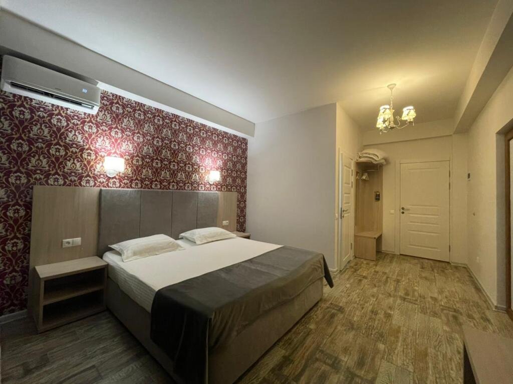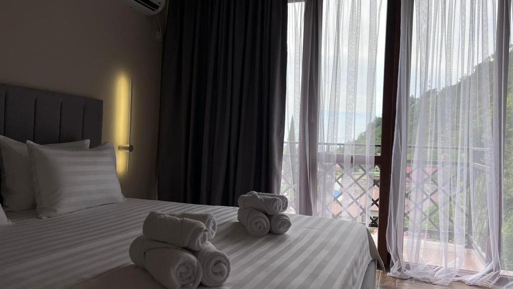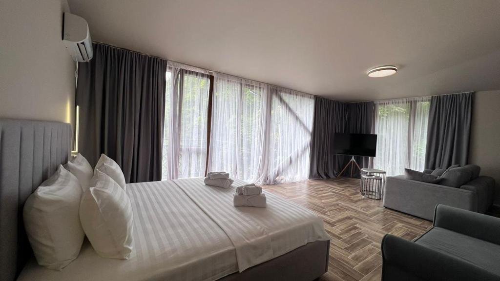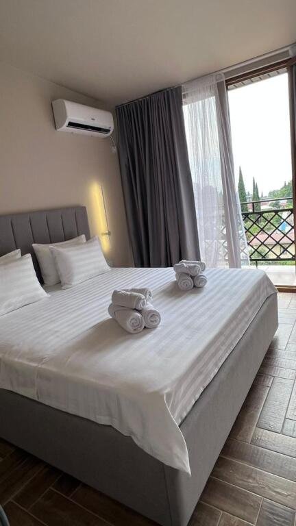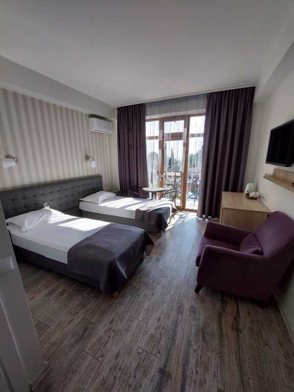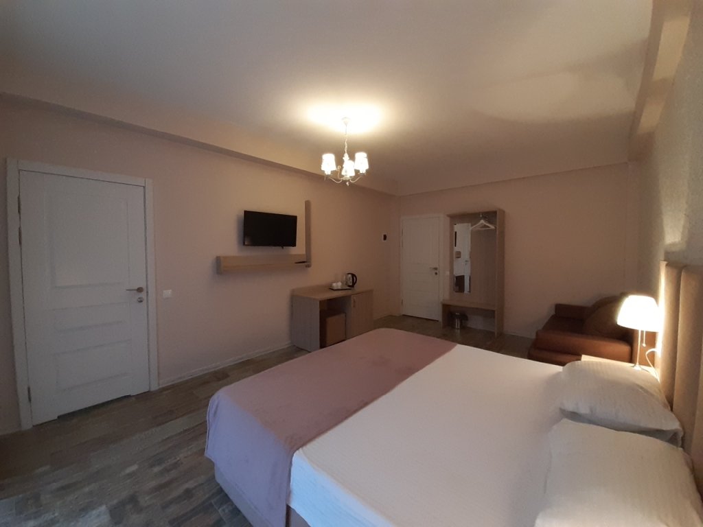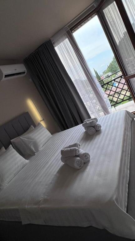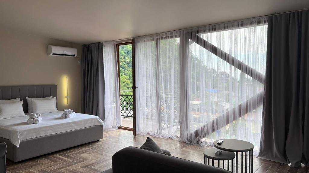 Прекрасные номера - хороший ремонт , Кровать, тумбы, стол, балкон с мебелью (стол и стулья), сушилка на балконе, интернет, телевизор с каналами разных фильмов , кондиционер, холодильник, комфортный матрас, Шторы блэкаут, отличная шумоизоляция, в душе полы с подогревом (это очень актуально при 100% влажности в Абхазии) , фен, мыло.
