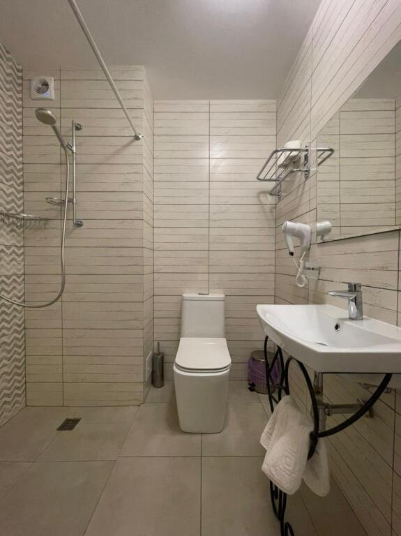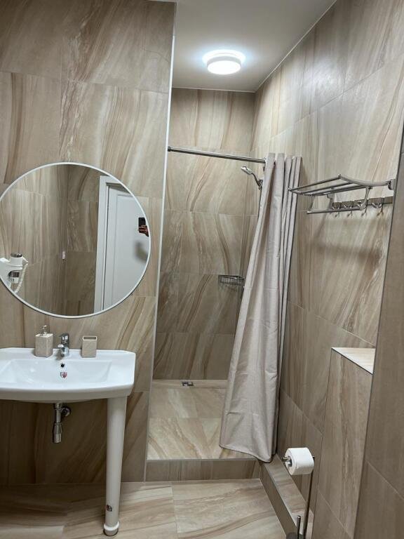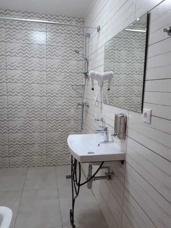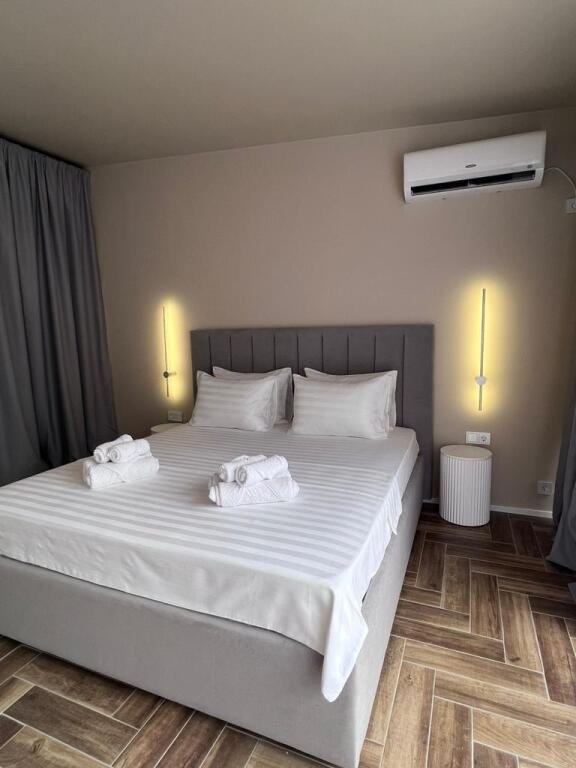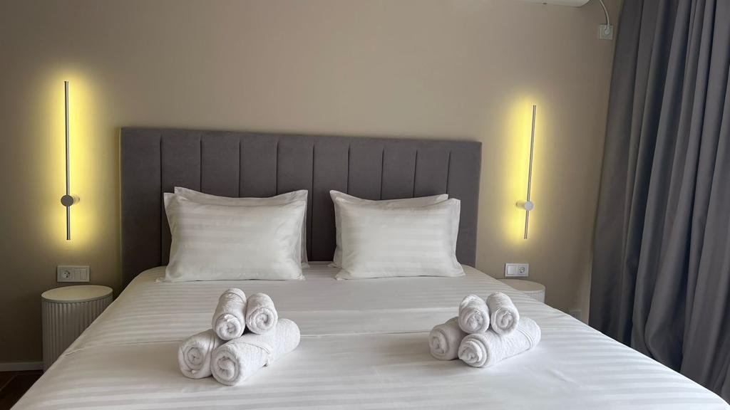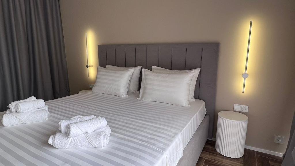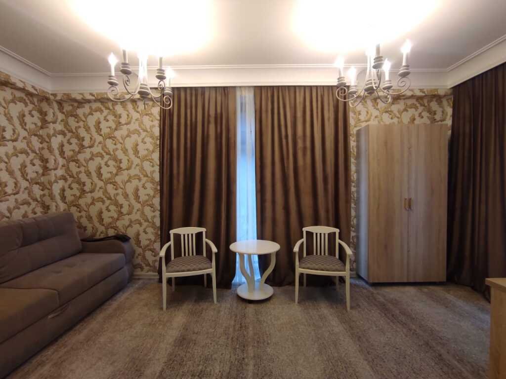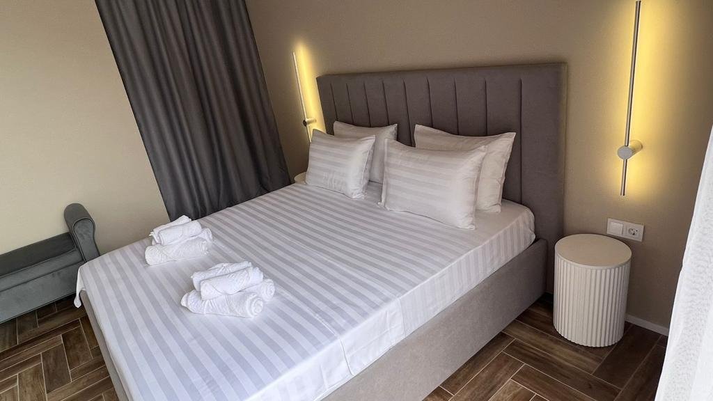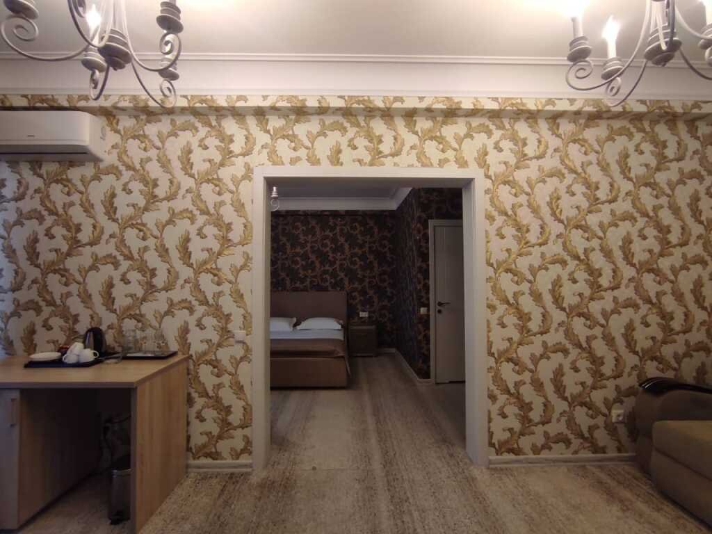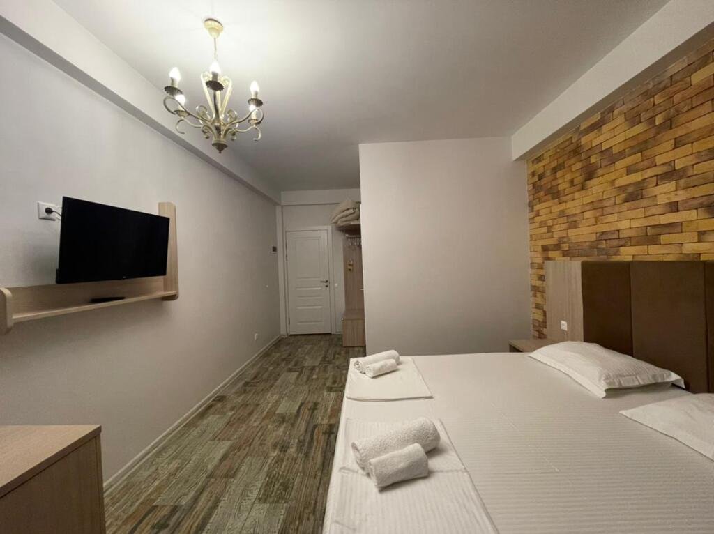 Прекрасные номера - хороший ремонт , Кровать, тумбы, стол, балкон с мебелью (стол и стулья), сушилка на балконе, интернет, телевизор с каналами разных фильмов , кондиционер, холодильник, комфортный матрас, Шторы блэкаут, отличная шумоизоляция, в душе полы с подогревом (это очень актуально при 100% влажности в Абхазии) , фен, мыло.