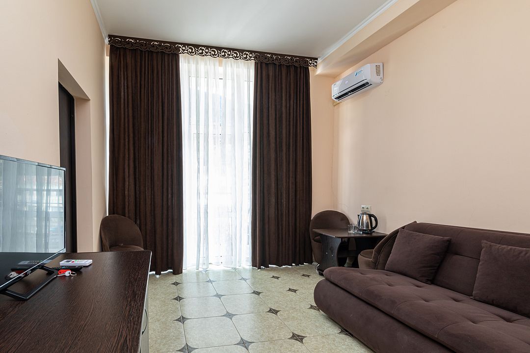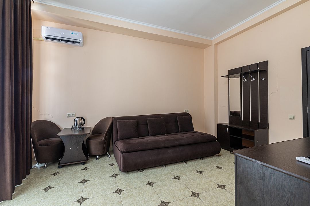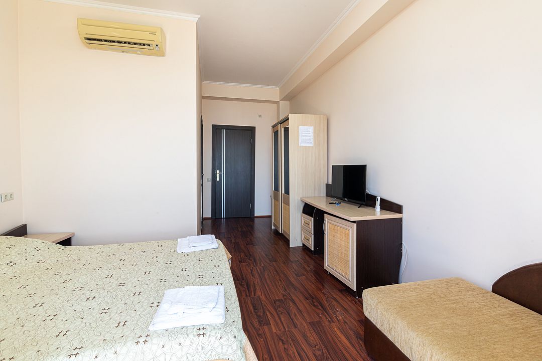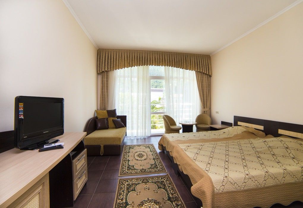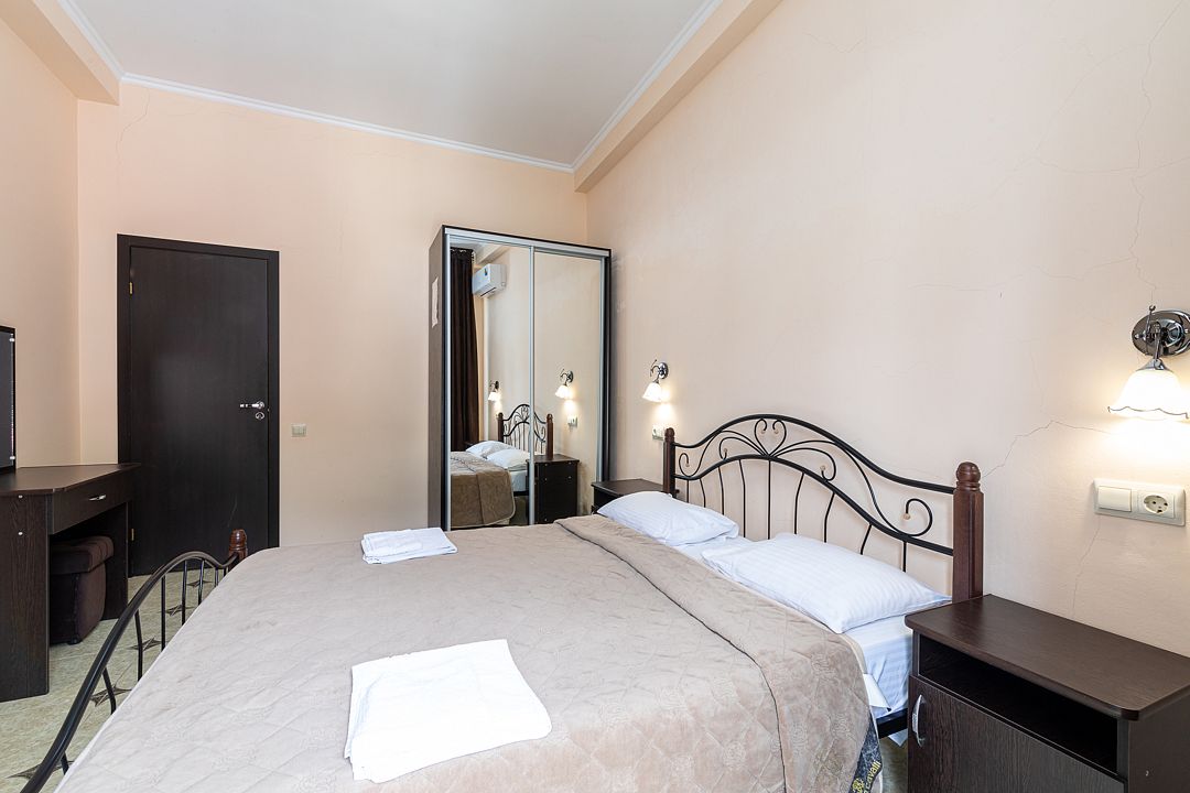 Дизайн гостиницы «Руслан» и ее территории отличается средиземноморским колоритом. Закрытый двор украшают фонтан, роскошные пальмы, уголки для отдыха и кафе. Отель работает круглый год и принимает гостей без возрастных ограничений – даже самых маленьких. Небольшие диваны в номерах легко превращаются в дополнительное место для размещения ребенка. Их же можно использовать как рабочий уголок – вместе с небольшим столом и двумя креслами. Кроме того, в каждом номере есть удобные кровати, телевизор, холодильник, кондиционер: это создает уют в любую погоду.