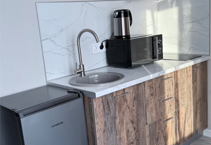 оборудованная мини-кухня (электроплита, микроволновая печь, чайник, холодильник, посуда), имеется дверь между кухней и спальней, номер с отдельным входом и общей открытой террасойУслуги и удобства