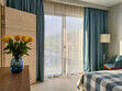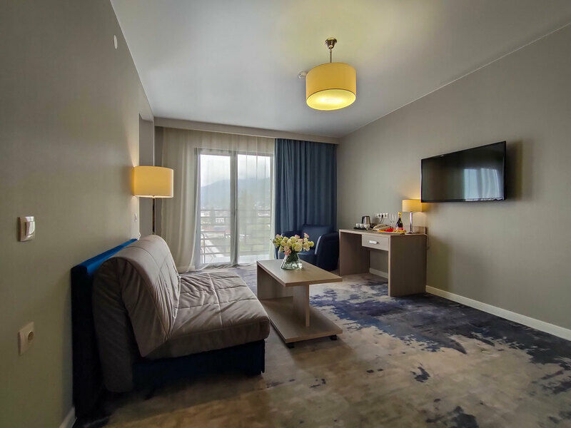 От аэропорта мы ехали на трансфере, границу прошли быстро. Приехали, нас сразу заселили. Мы жили на 4 этаже, вид из окна шикарный, с видом на горы и на море.
