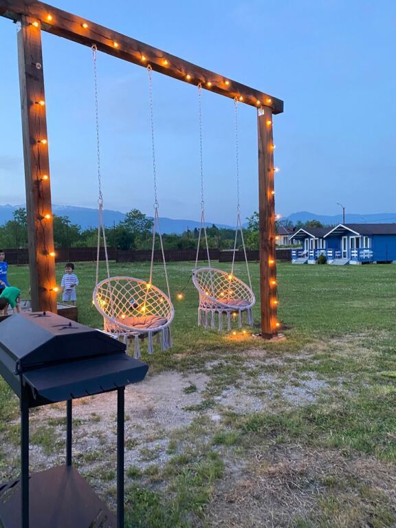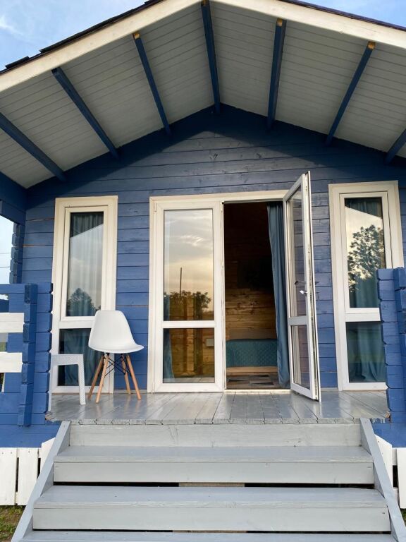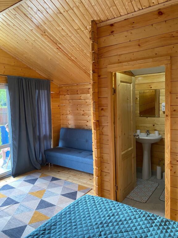 Эко-домики площадью 26 кв. м построены из сосны и оборудованы необходимыми для проживания удобствами. В одном доме доступны до 4-х спальных мест. Травяная поляна — 30 соток земли. Есть игровая зона для детей с песочницей и качелями. В распоряжении гостей: патио-зона для отдыха взрослых, мангальная зона, веранда с кухней, а также собственный фруктовый сад и бесплатная автостоянка во дворе.