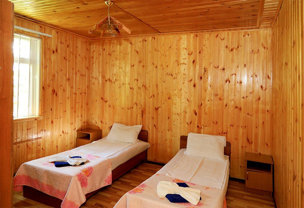 Домики деревянные, в которых дышится и спится легко, утром просыпаешься от пения птиц. На территории базы очень много зелени, что спасает днем от жары.