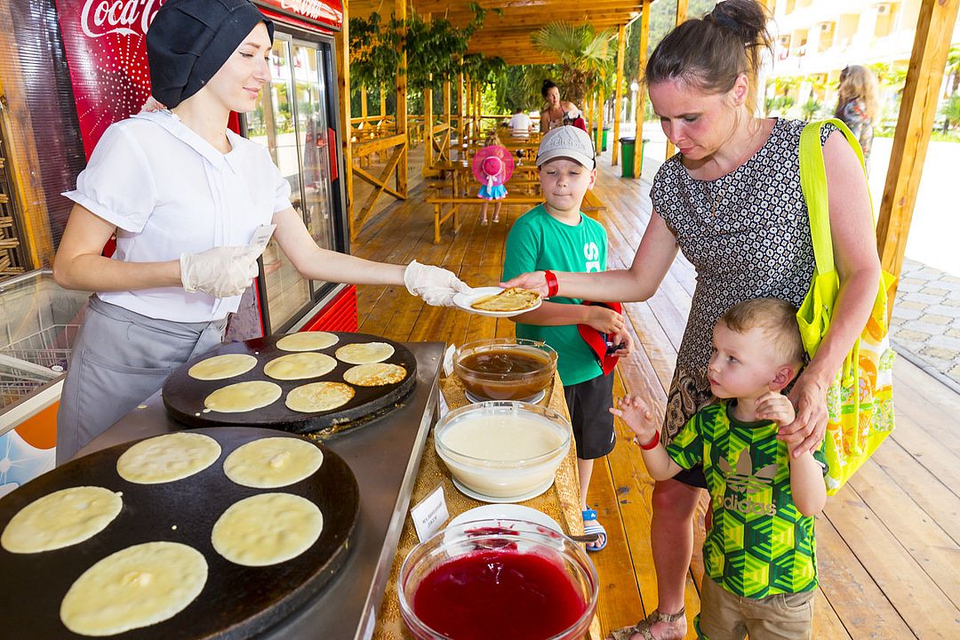 - кафе возле бассейна и на пляже (легкий аперитив и легкие закуски: блины, мороженое, слабоалкогольные и безалкогольные напитки местного производства (10:00-20:00)