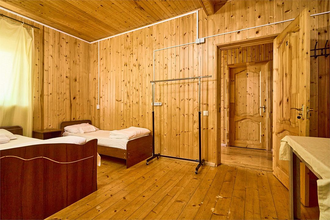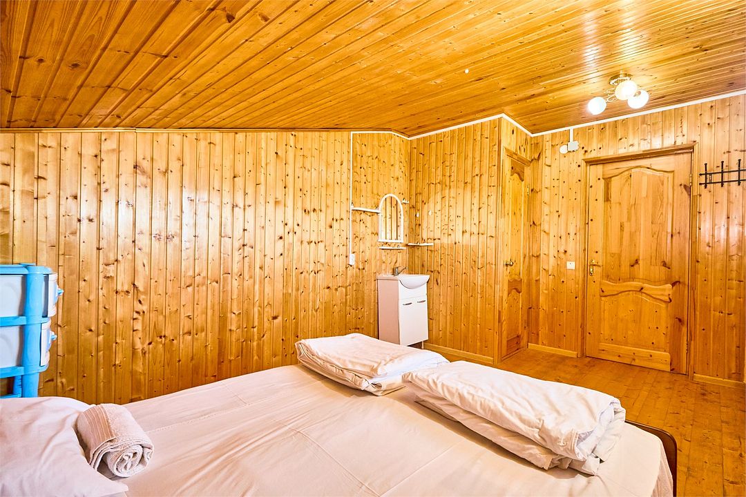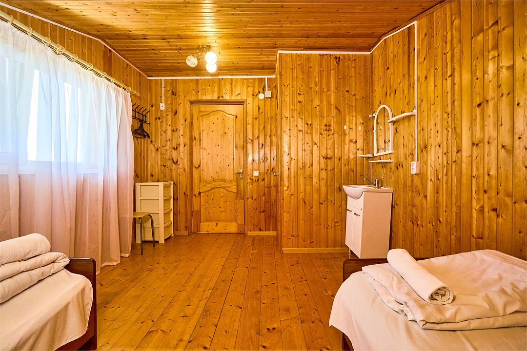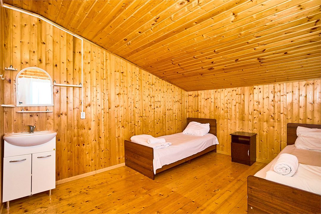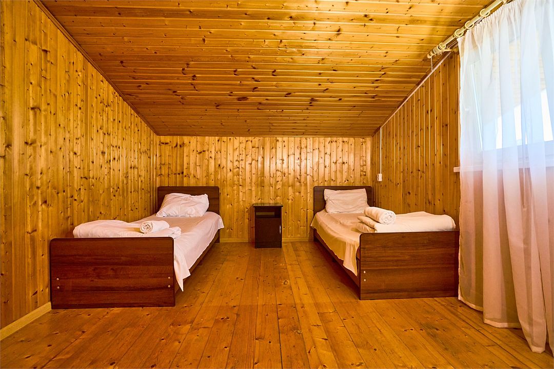 На втором этаже находятся номера, в каждом из которых есть две односпальные кровати, стол, стулья, холодильник, тумбочка и раковина. Также в номере есть зеркало. Санузел в номере отдельный. Душ общий и находится на первом этаже. Кондиционер в номере не предусмотрен. Интерьер выполнен в деревянном стиле.Двухместный стандарт