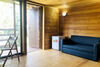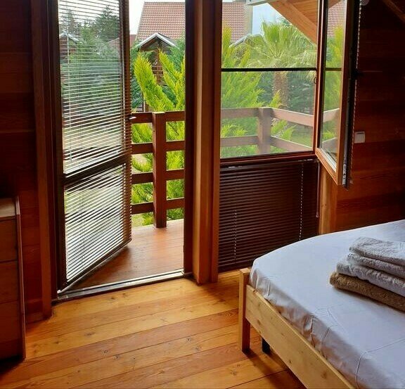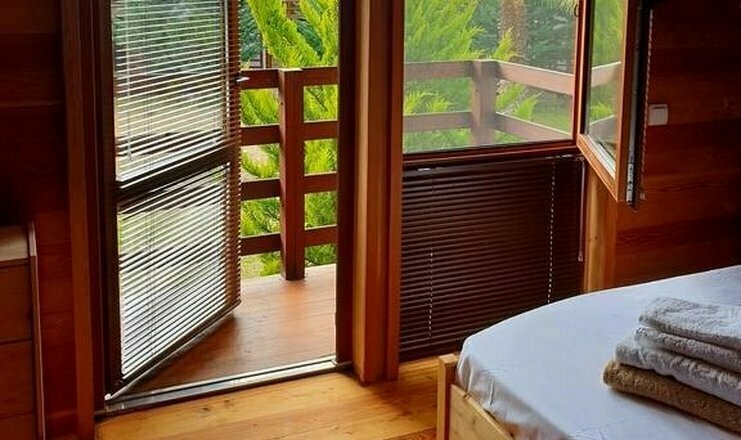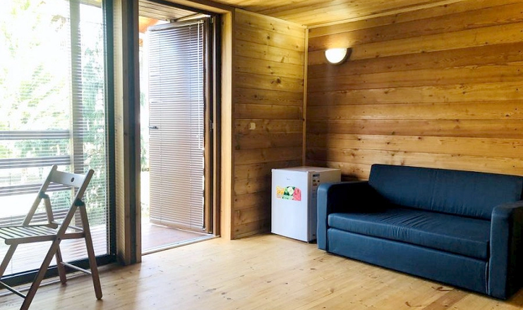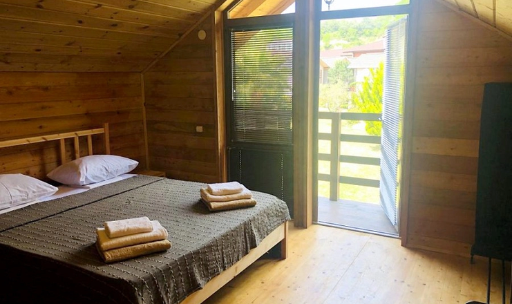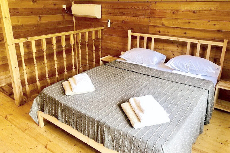 В каждом коттедже на втором этаже расположена спальня, на первом этаже находится гостиная и санузел.