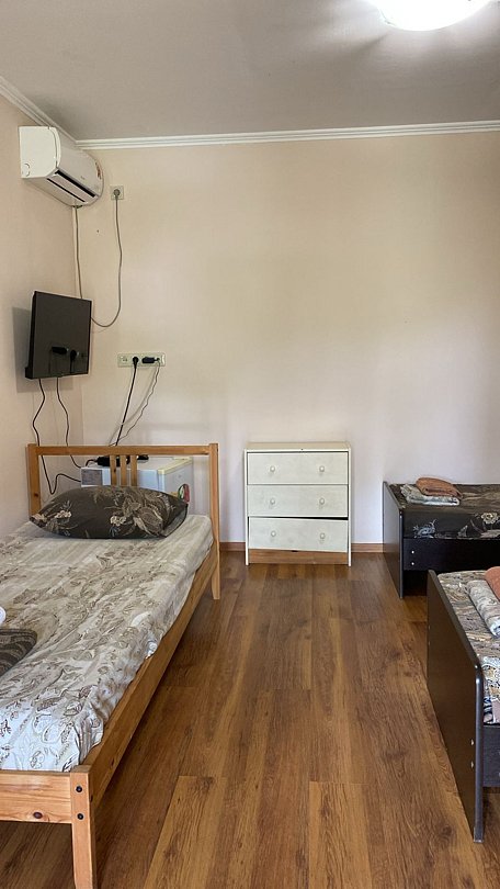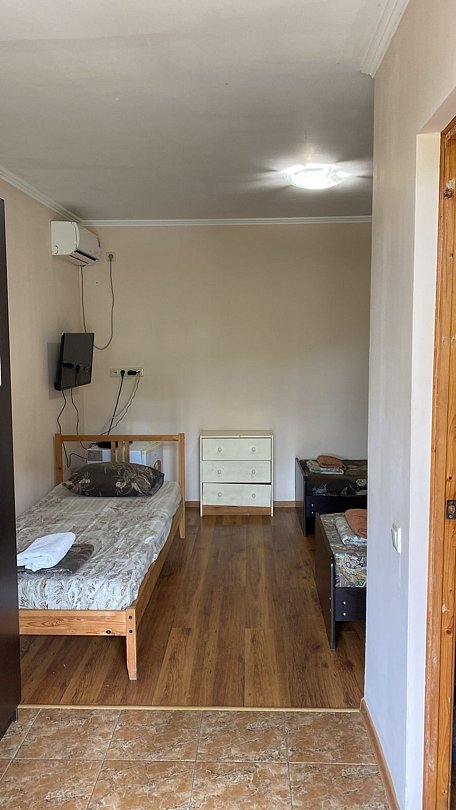 3 х местный номер с санузлом, кондиционером, холодильником, ТВ. Расположен на первом этаже, с отдельным входом. Вид во двор.