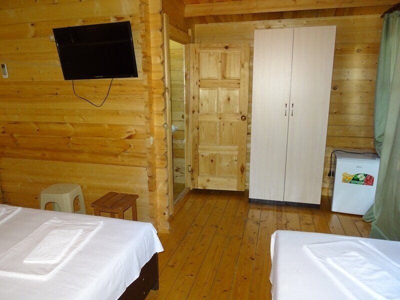 В домиках есть все необходимое для комфортного проживания- 2-спальная кровать и 1-спальная кровать, ТВ, Wi-Fi, холодильник, сплит-система. Санузел/душ находятся в каждом номере.