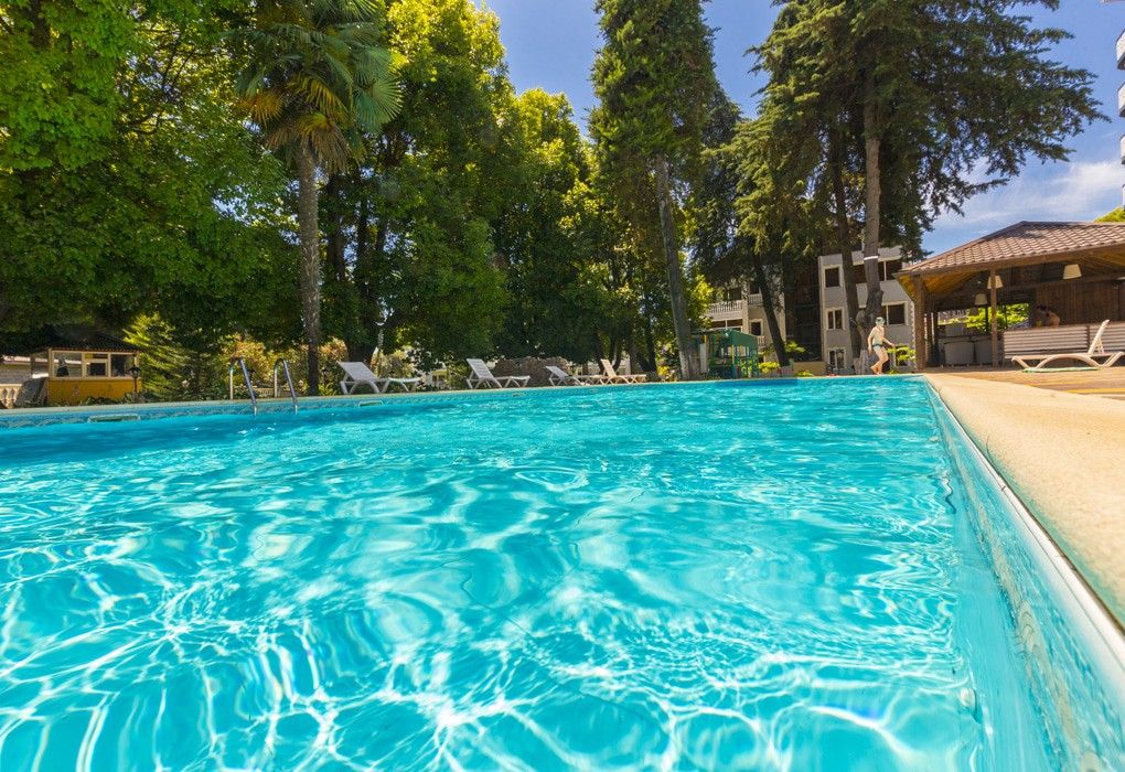Четырехэтажный корпус отеля принимает гостей с мая по октябрь. Пансионат «Водопад» расположен на закрытой благоустроенной территории, в окружении пышных южных растений. Под сенью деревьев и открытым небом гостей ждет прекрасный бассейн с зоной отдыха – шезлонгами на площадке, вымощенной разноцветной плиткой. Зеленые лужайки, прогулочные дорожки, клумбы радуют отдыхающих разного возраста. Для детей оборудована игровая площадка.
