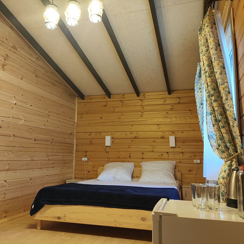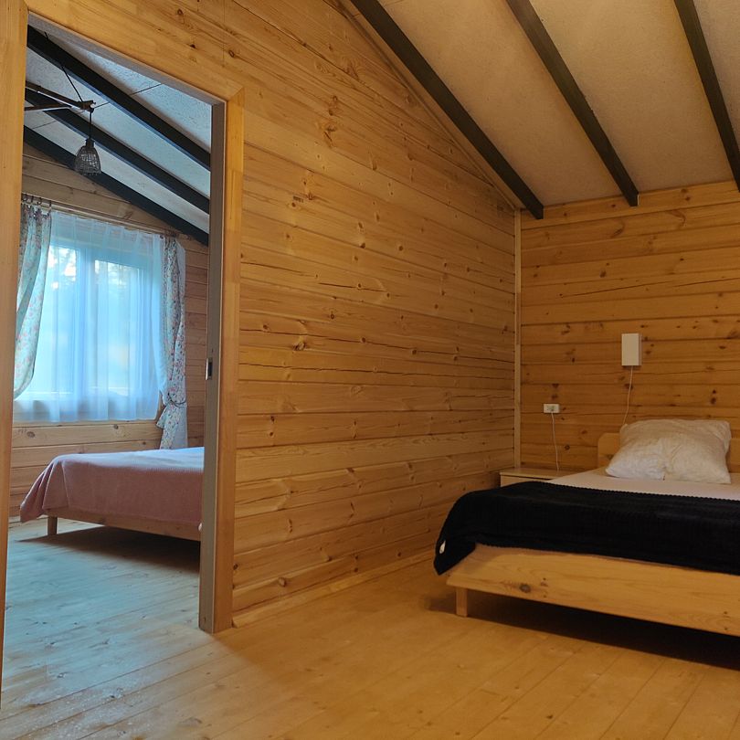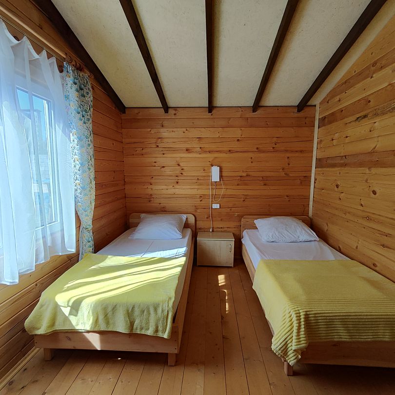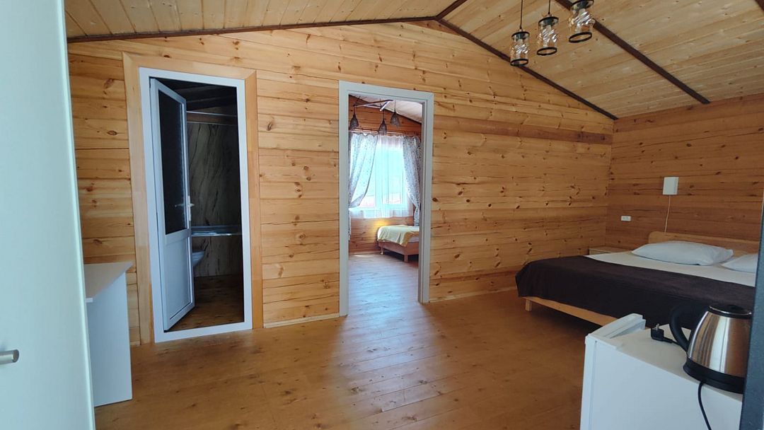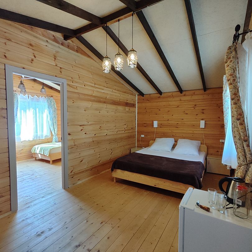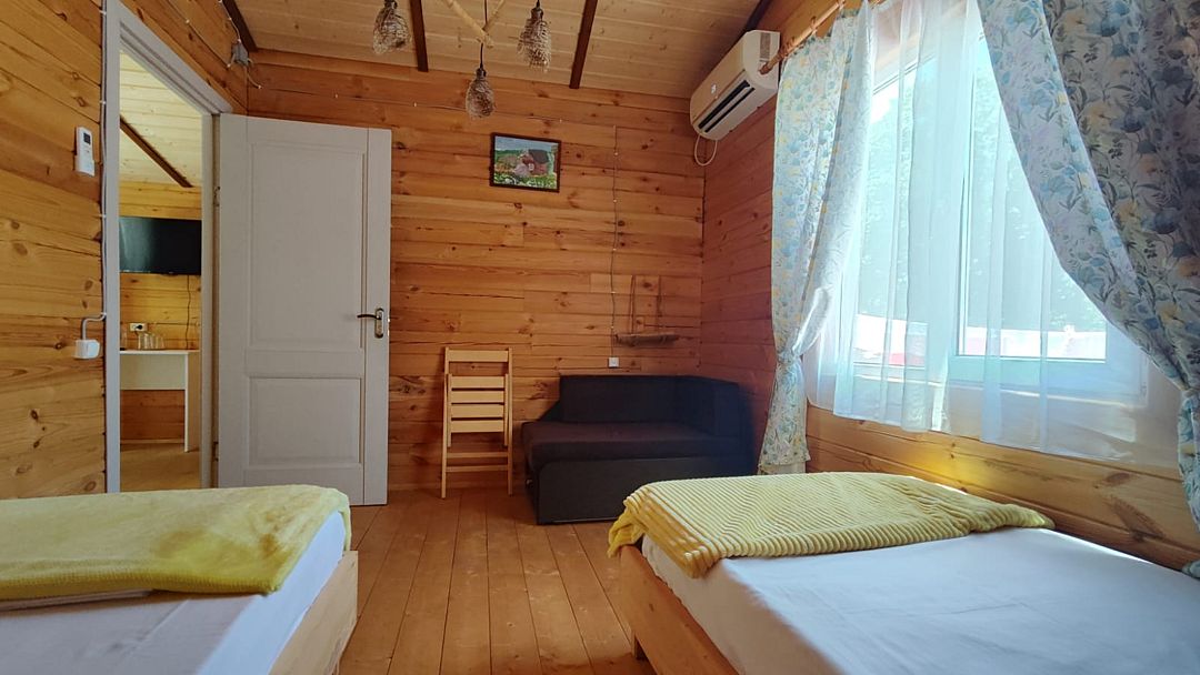 Домик двухкомнатный, с двумя двуспальными кроватями и раскладным креслом, возможно дополнительное место. Вмещает 5-6 человек.