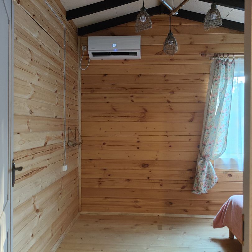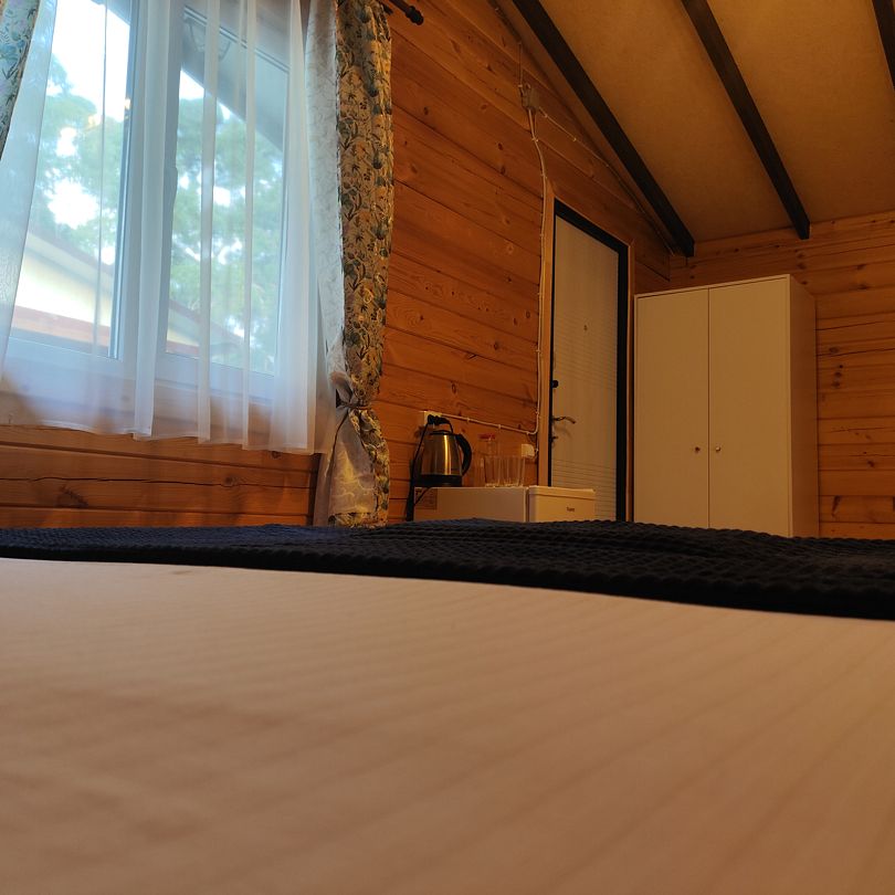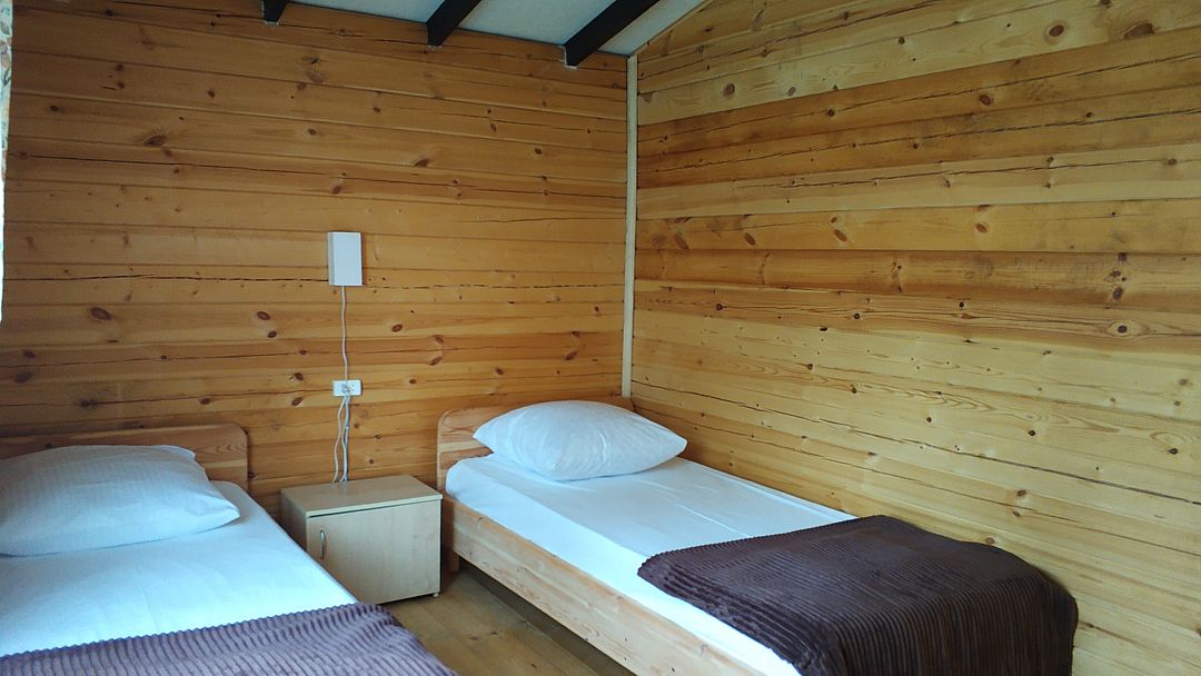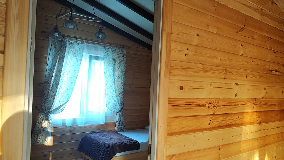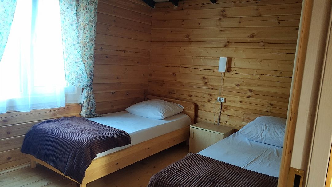 Домик двухкомнатный, с двумя двуспальными кроватями и раскладным креслом, возможно дополнительное место. Вмещает 5-6 человек.