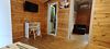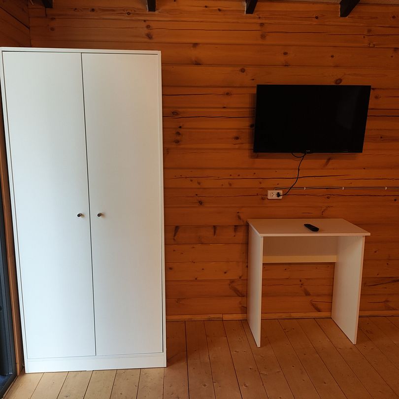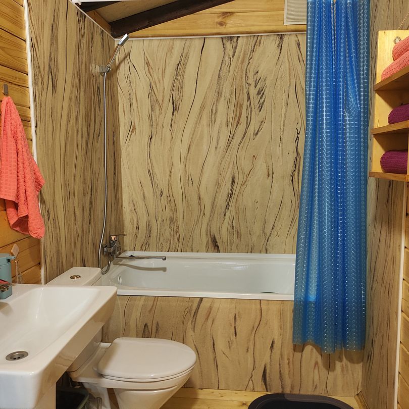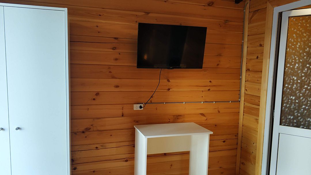 Домик двухкомнатный с двуспальной кроватью , двумя односпальными. возможно дополнительное место. Вмещает 5-6 человек. Оснащён: кондиционером, ТВ, Wi-Fi, холодильник, санузел, чайник, фен, сейфом выдаем полотенце, туалетную бумагу и мыло.