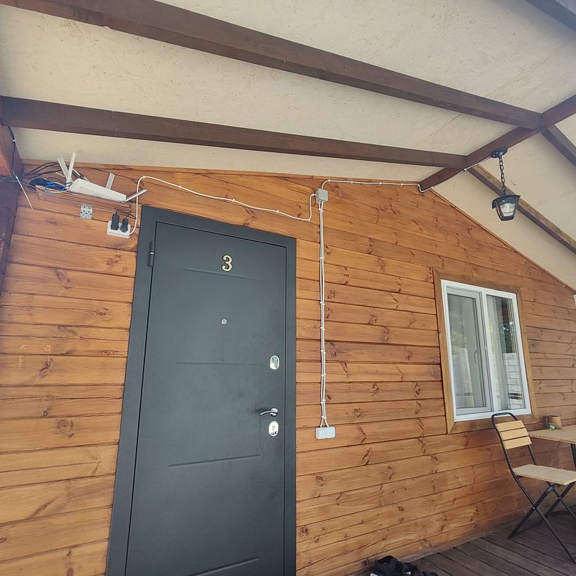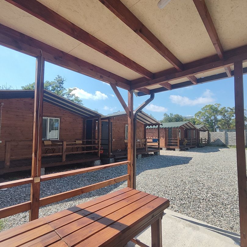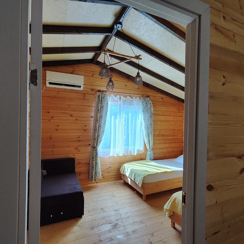Индивидуальные двухкомнатные, просторные домики со всеми удобствами выполнены из деревянного бруса. Домики вмещают до 6 человек. Все они оснащены санузлом, ТВ, кондиционером, холодильником, Wi-Fi, чайником, феном. У каждого домика есть терраса с садовой мебелью. Вас порадует красивейший вид на горы, аромат эвкалипта в воздухе и близость к ласковому, чистому морю, до которого всего 250 м.