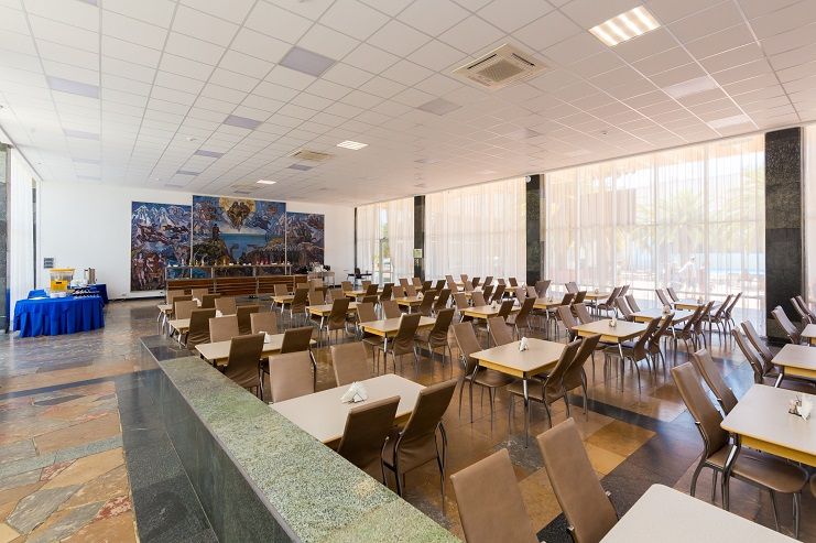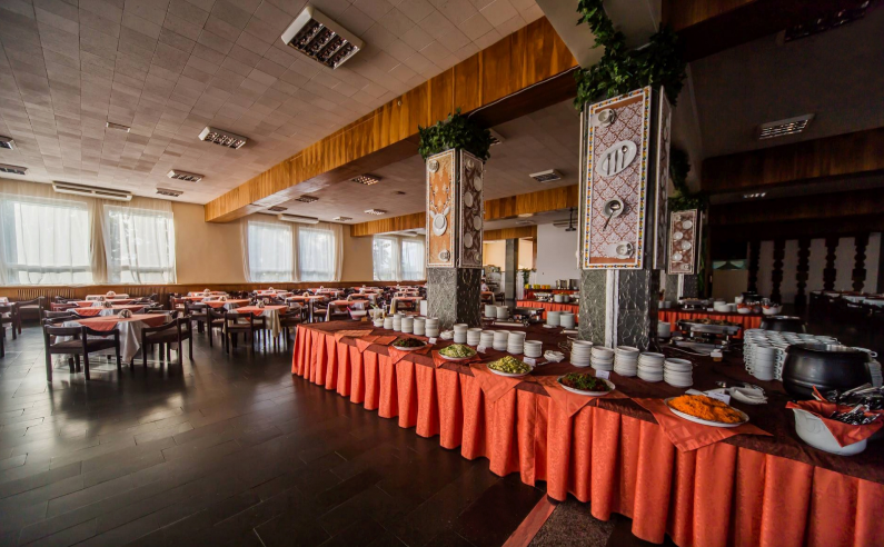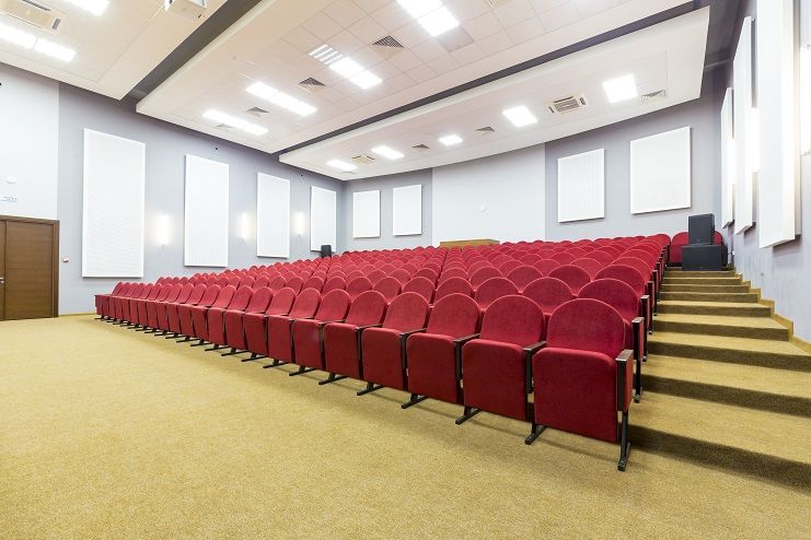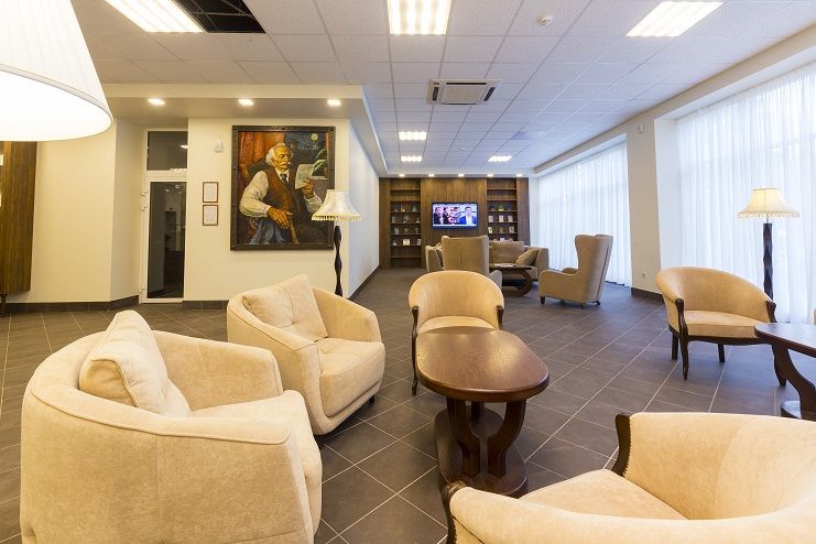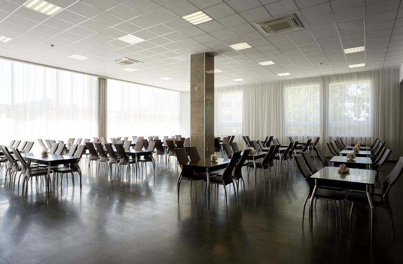 Красно-коричневое оформление концертного зала дома отдыха идеально впишется в формат конференции, семинара, съезда или симпозиума, поэтому проводить подобные мероприятия принято в стенах именно этого заведения. Здесь имеется оборудованная паркетная сцена, профессиональная акустика и свет, наличие фортепиано и возможность оборудования сцены столами для председателя и трибуной для лектора.