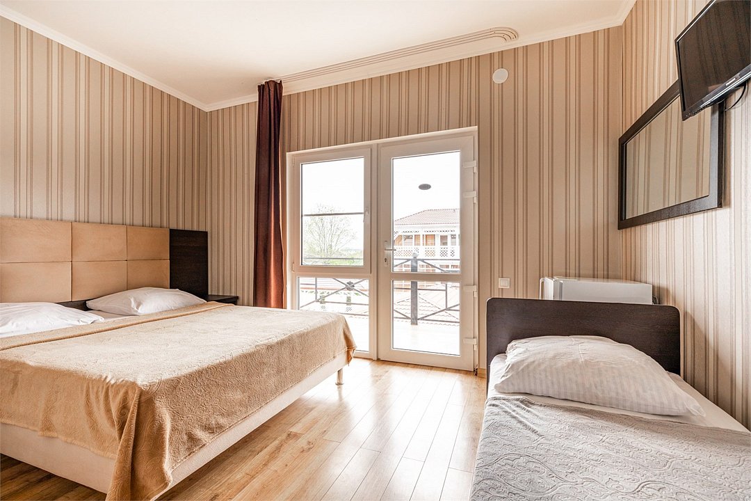 телевизор, Wi-Fi, кондиционер, душевая кабина, санузел, банные полотенца, двуспальная кровать, две односпальные кровати, тумбы, шкаф для одежды, вешалки, звуконепроницаемые стены и окна, обслуживание номеров, раковина, косметическое зеркало, питьевая вода, вид во двор, ламинат, стаканы, стул, тумба, сушилка для белья, мини-холодильник, уборка номера, вода из артезианской скважиныВ номере