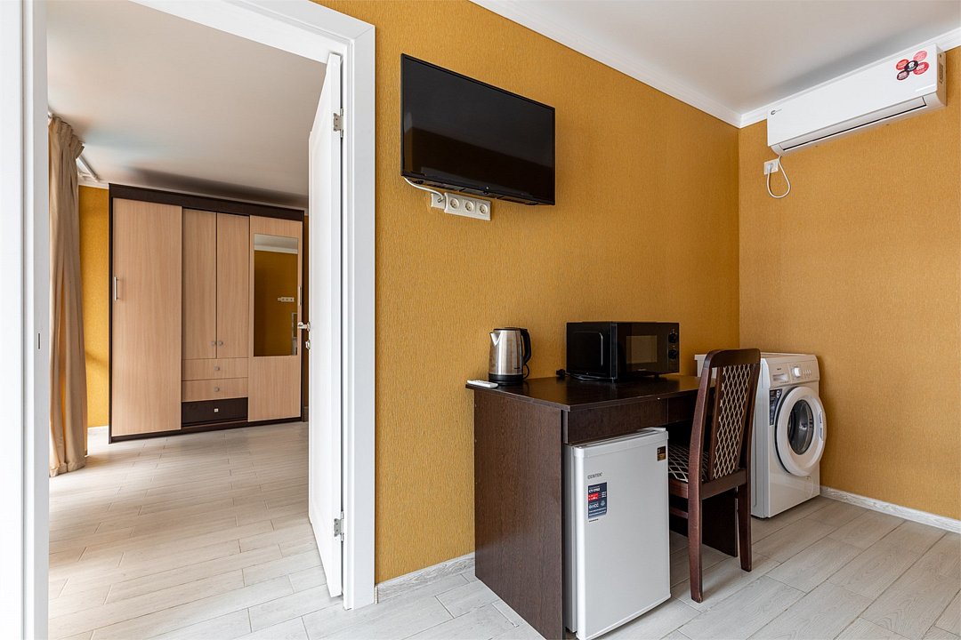 телевизор, Wi-Fi, интернет, холодильник, кондиционер, фен, микроволновая печь, душевая кабина, ванна или душевая кабина, санузел, банные полотенца, пляжные полотенца, гигиенические средства, косметические средства, двуспальная кровать, две односпальные кровати, шкаф для одежды, зеркало, пуфики, звуконепроницаемые стены и окна, обслуживание номеров, стиральная машина, чайник, унитаз, раковина, косметическое зеркало, питьевая вода, душ, вид во двор, ламинат, стаканы, туалетный столик, стул, стол, тумба, туалетный столик, туалетные средства, туалет, сушилка для белья, мини-холодильник, гостиничная парфюмерия, телевизор со Smart TV, номер для некурящих, вид на бассейн, экологичный подход, уборка номера, вешалки-плечики, мыло, затемняющая штора, международная розеткаВ номере