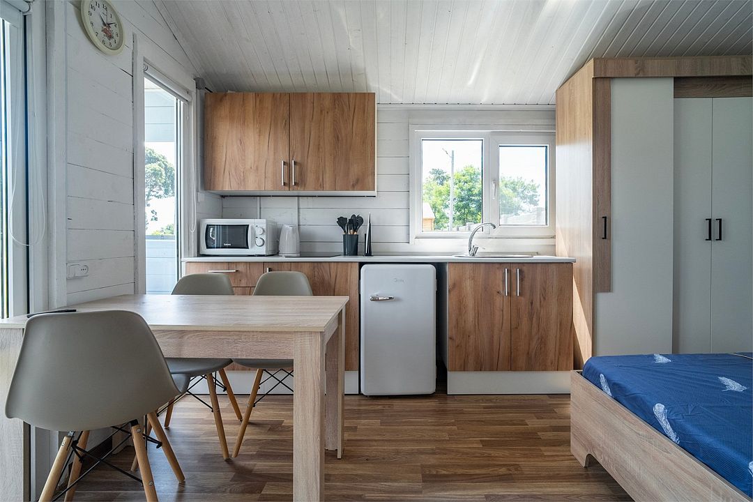 Однокомнатный номер, оформленный в классическом стиле. Оснащен всем необходимым для комфортного пребывания. - площадь Гостевого Дома 27м2: студия 17м2 су, душевая 3м2 веранда 7м2 - бесплатный устойчивый Wi-Fi (100МГБ) - кровать двуспальная 2*1,8 - кровать двухъярусная 2*0,9 - кондиционер - эл. Чайник - фен - TV (Smart tv wi-fi) - Кухня (холодильник, микроволновка, эл плита) - стол обеденный, 4 стула - детский мини бассейнУслуги и удобства