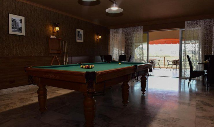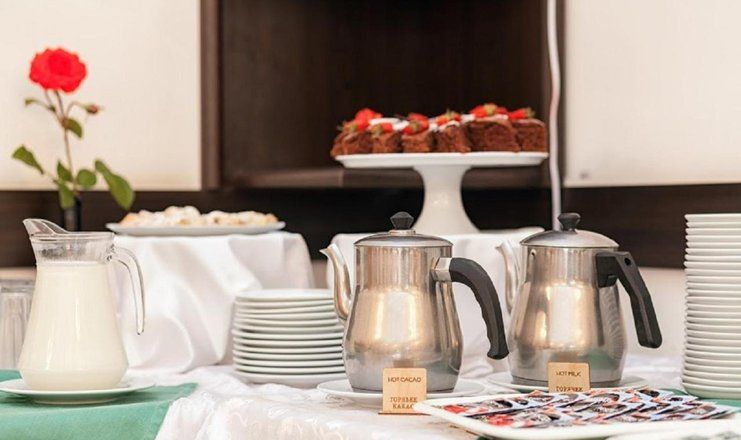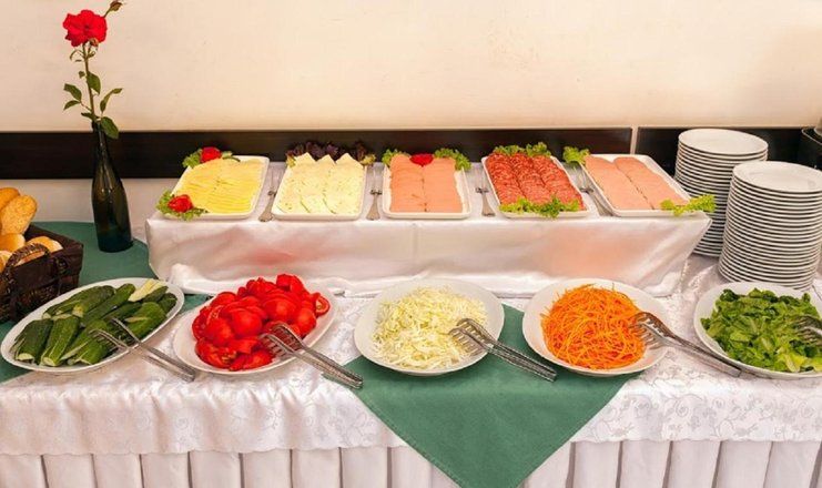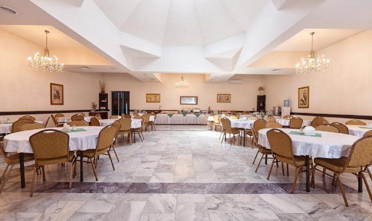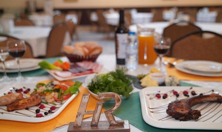 На территории есть свой ресторан, по утрам в нем накрывают шведский стол. В его зале царит атмосфера располагающая к общению и подходящая проведения праздничных мероприятий.