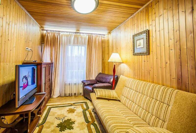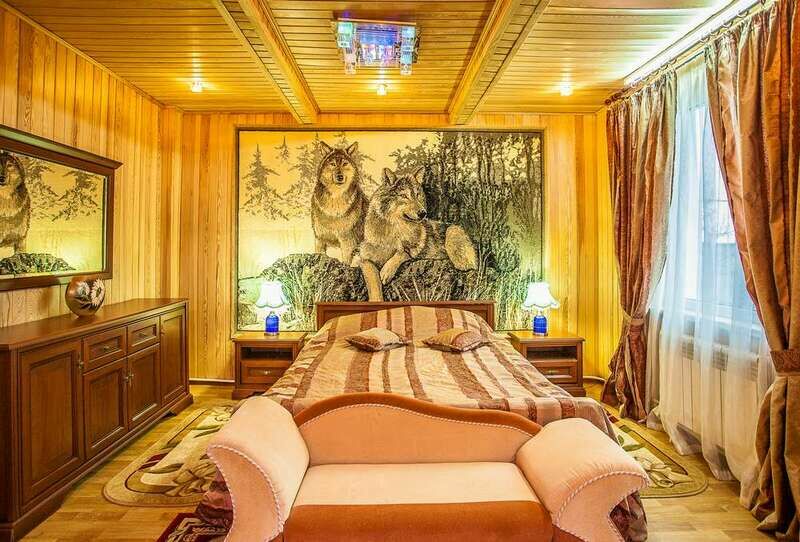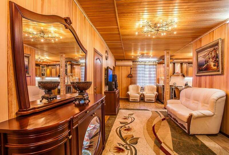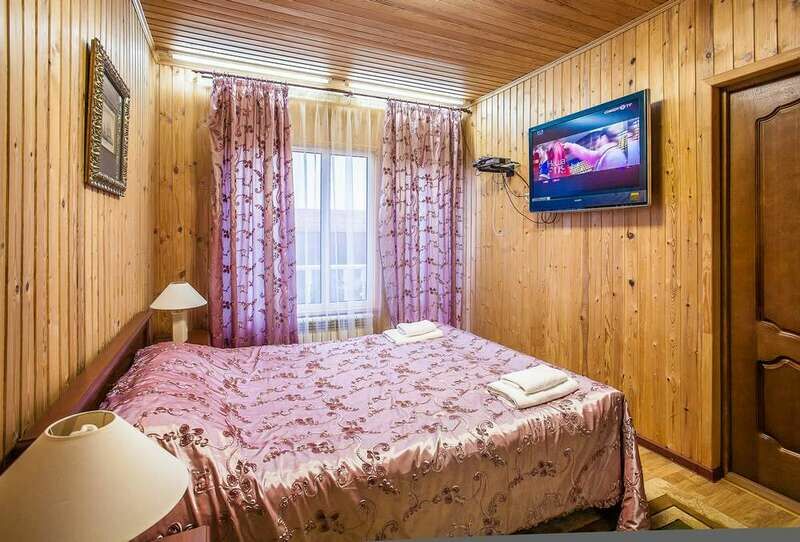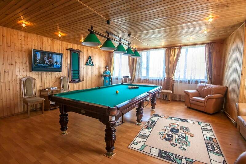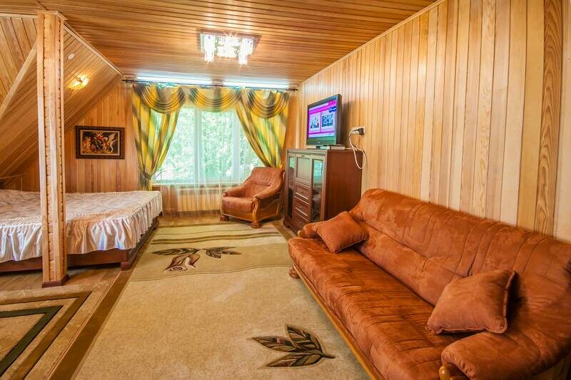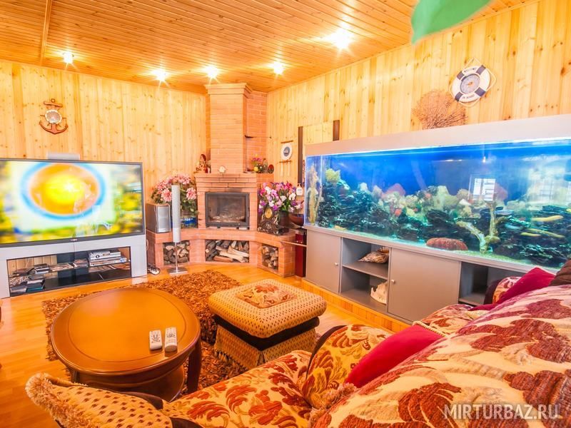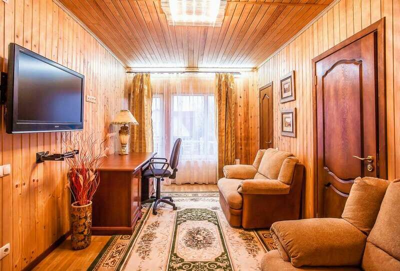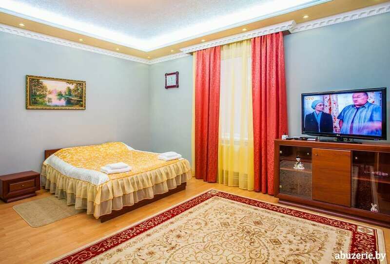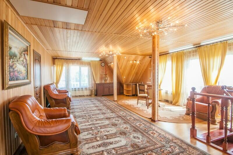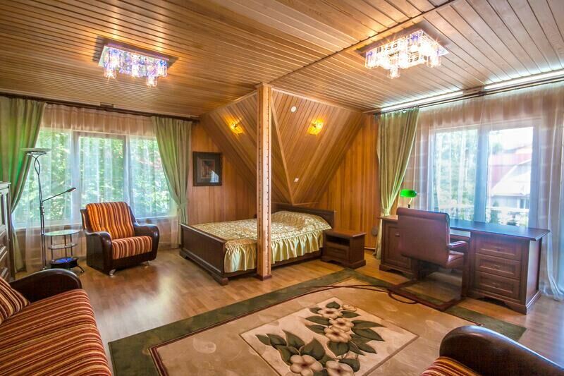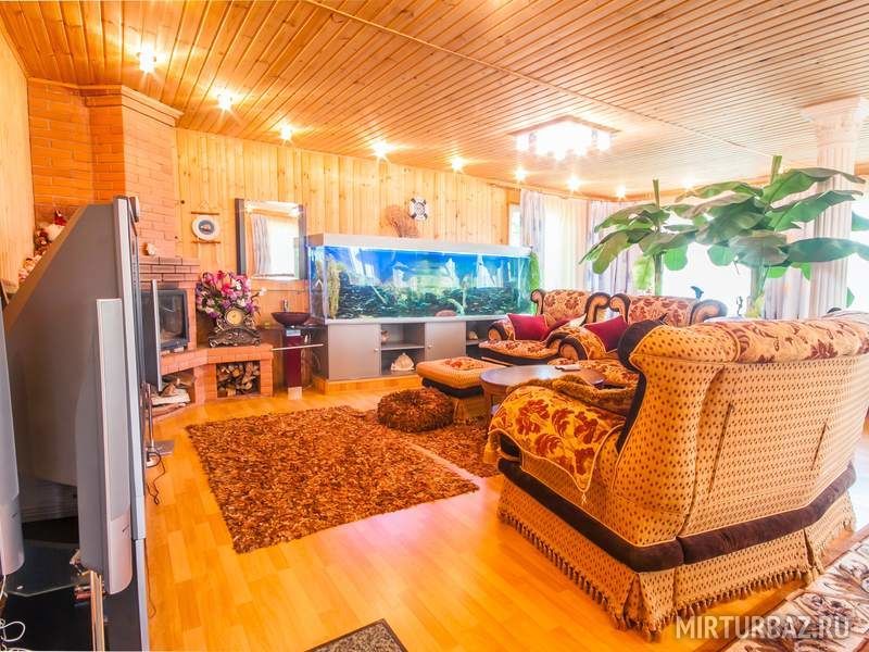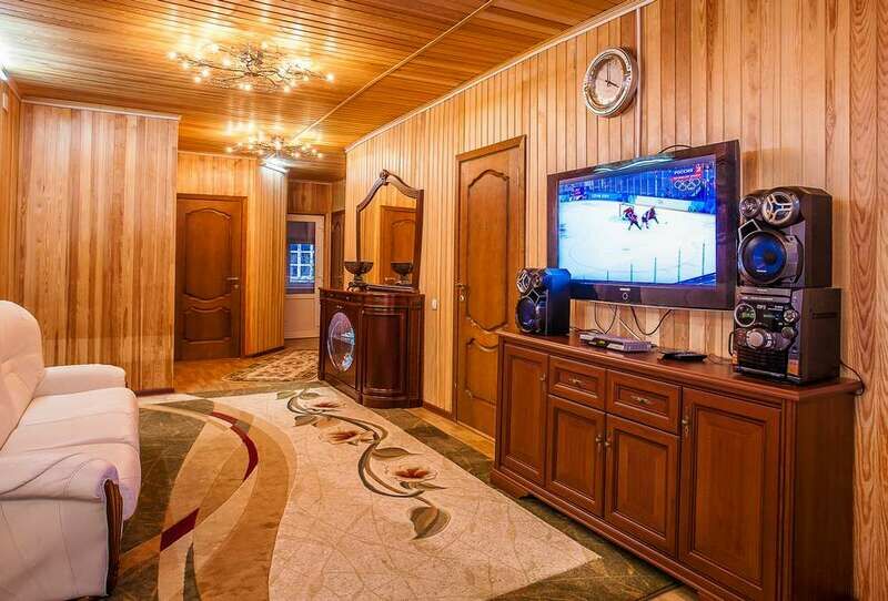 Коттедж построен со всей широтой белорусской души: три просторные светлые комнаты, отделанные деревом, камин, настоящий русский бильярд, огромный аквариум с рыбками, шикарная мебель из красного дерева, большие телевизоры — это немаловажные детали для тех, кто привык к комфорту и уюту высшего уровня