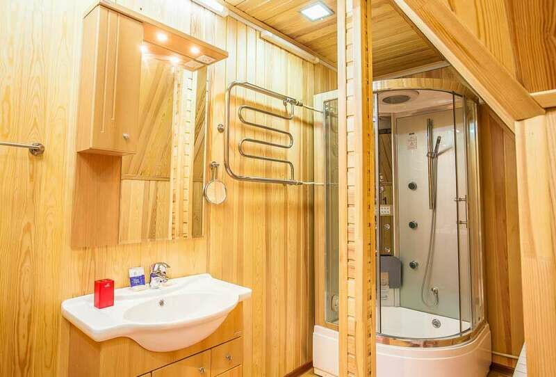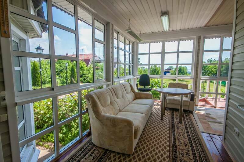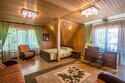Две гостиные обставлены элегантной кожаной мебелью, а вид из окон на огромное озеро создает ощущение покоя и единения с природой. Любители попариться могут сделать это в бане усадьбы «Абузерье». В любую погоду приятно устроить «посиделки» на застекленной террасе дома и насладиться чашкой любимого кофе или чая.