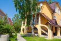 Коттедж «Тройка» имеет открытую террасу и современный дизайн интерьера, а яркий цвет фасада выделяет его на фоне других коттеджей.