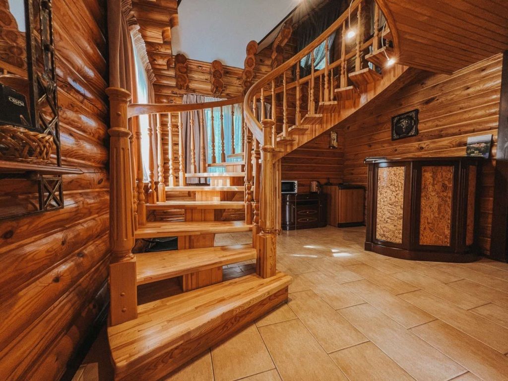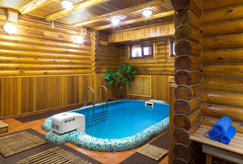 На первом этаже бани находятся душевые кабины, просторная парная с вениками и бассейн с подсветкой, гидромассажем и температурой воды до 22 градусов.