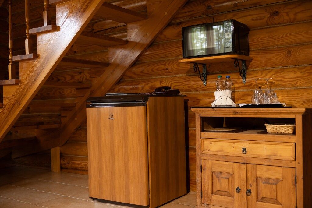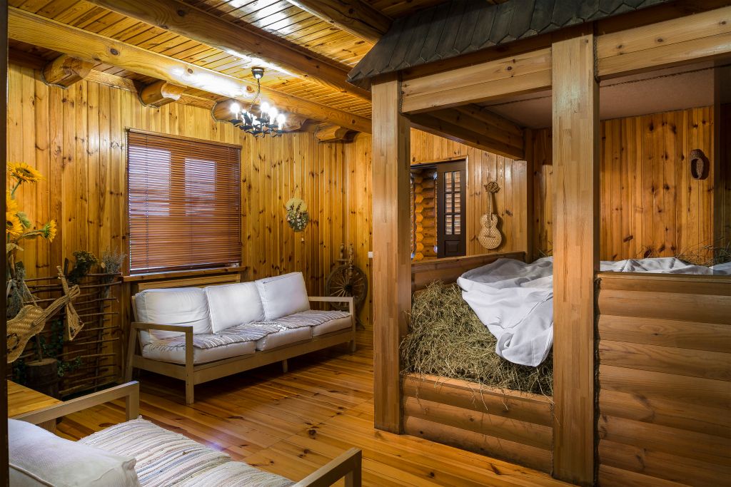 На втором этаже — большая комната отдыха с банкетным столом на 10 человек, холодильником, микроволновой печью, электрочайником и телевизором. Продолжением комнаты отдыха является открытая лоджия с диванами. Расслабиться после банных процедур Вы сможете в уютной комнате с двуспальной кроватью или в отдельном зале с настоящим сеновалом.