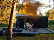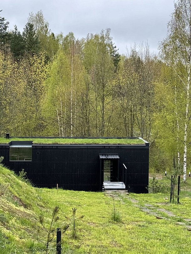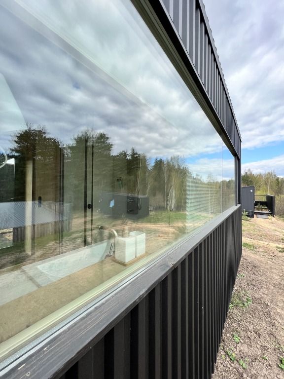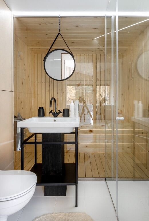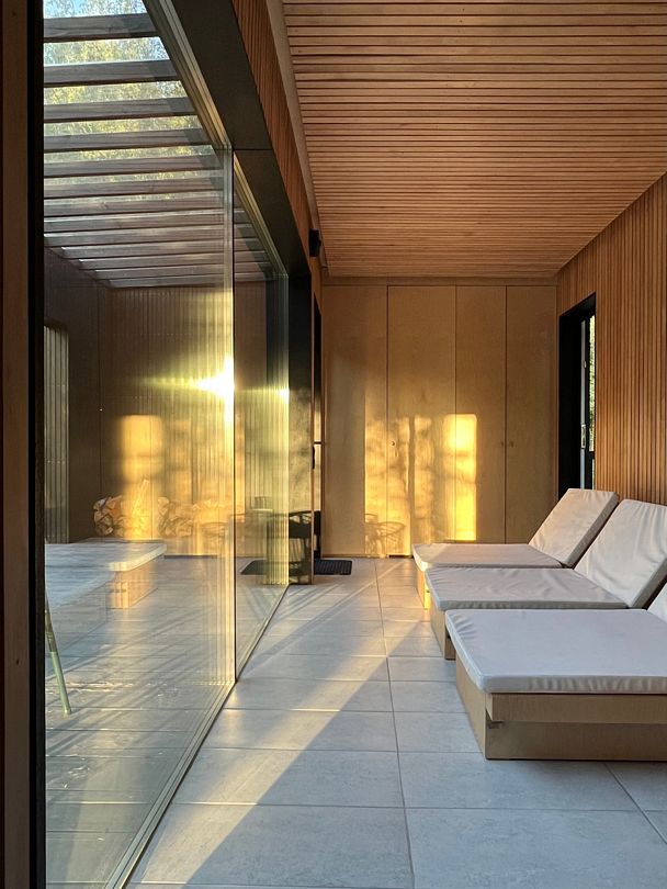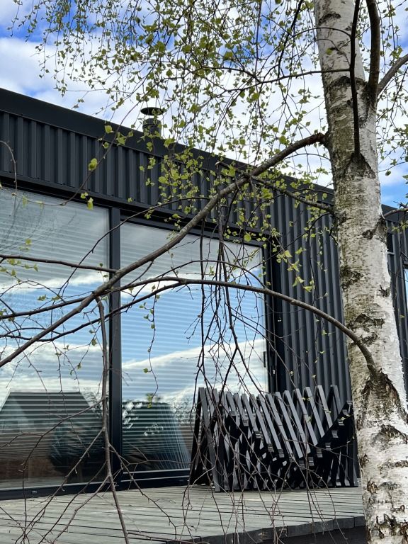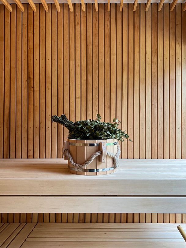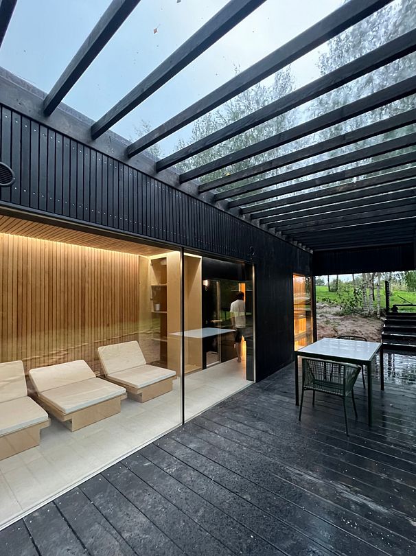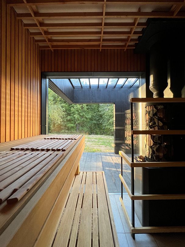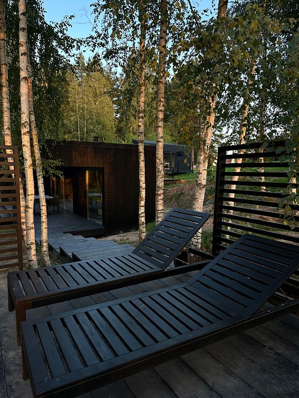 На территории глэмпинга имеется панорамная сауна на дровах с травяной крышей и стеклянной душевой. Вместе с сауной можно арендовать подогреваемую купель и насладиться отдыхом на террасе среди берёз.