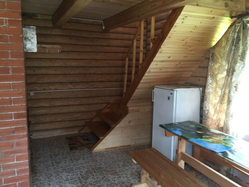 На первом этаже размещена кухня, столовая, туалет. Есть холодная вода, газовая плита, холодильник, посуда. Горячая вода и душ размещены в 10 метрах от домика в бане. На втором этаже размещены спальни: одна кровать двухспальная, одна кровать односпальная, диван для 2 человек, так же имеется телевизор.