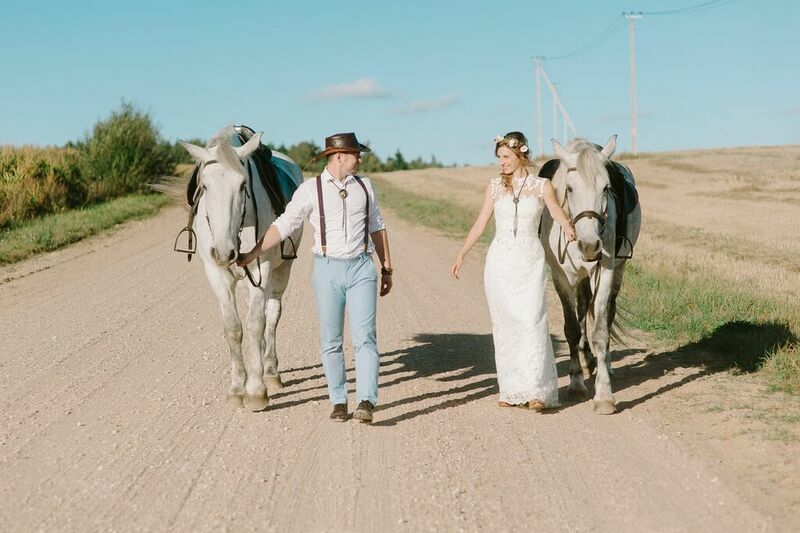Бескрайние поля, глубокое синее небо, душистый запах сена, ощущение ласкающего ветра в волосах и теплого дыхания лошади — все это ждет вас в Буцевичах, если вы решите доверить организацию и проведение выездной регистрации и свадебного торжества базе.