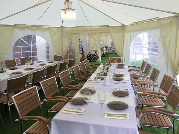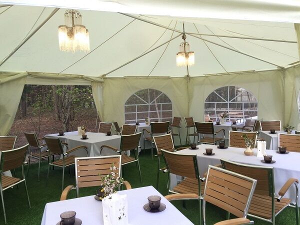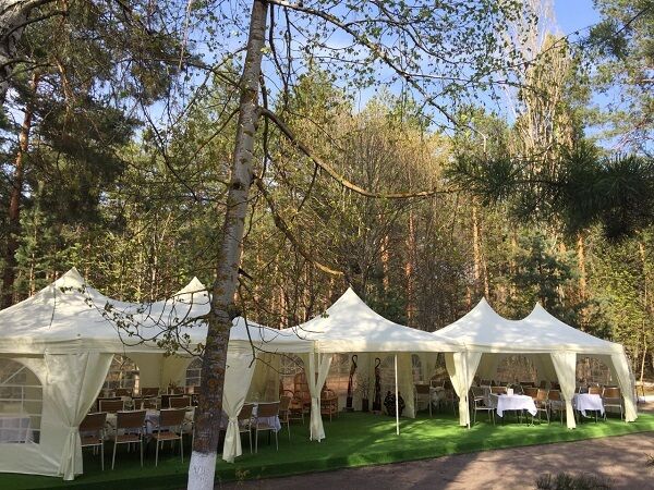 Обеденный зал в кафе вмещает до 100 человек. Здесь гости дома отдыха получают 3-разовое экологически чистое питание. Здесь же организуются банкеты, свадьбы, корпоративы. Если гостей много, провести мероприятие можно на открытой площадке – в шатрах, которые работают в любое время года. Оборудована летняя площадка для отдыха и пикников с барбекю, мангалом и грилем.