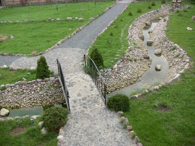 Рядом с самой усадьбой есть чистая искусственно созданная речка с проточной водой и красивыми натуральными камнями. Здесь можно полюбоваться оригинальной скульптурой, понаблюдать за резвящимися в воде рыбками, позагорать на берегу. Собственный песчаный пляж в пяти минутах ходьбы от самой усадьбы позволит всем любителям «тихого отдыха» насладиться покоем, чистой водой, ярким солнцем с максимальными удобствами.
