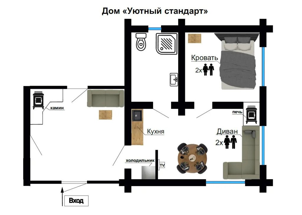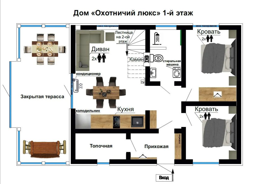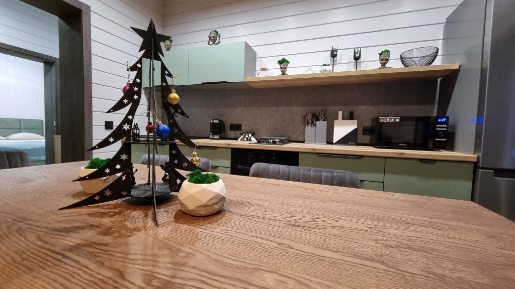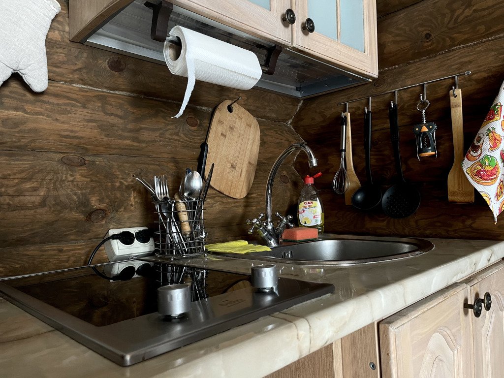 Среди удобств — камин, русская печка, кондиционер, телевизор, душевая кабина, уличная мебель. Кухня обустроена современной бытовой техникой, холодильником, варочной панелью, посудой, обеденным столом.