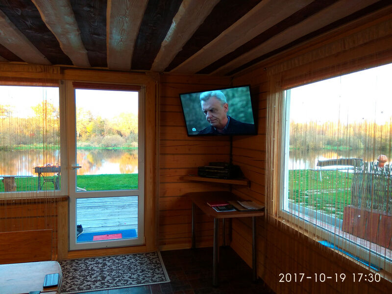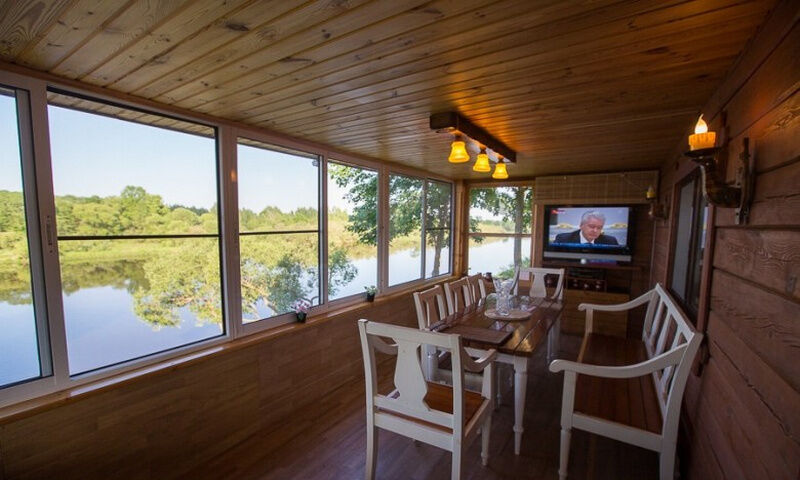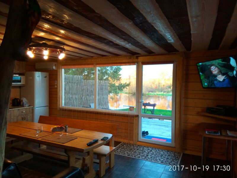 Окна на первом этаже выходят на живописную реку, а в комнате отдыха, расположенной совсем недалеко, вам будет удобно и приятно готовить вкусные блюда.