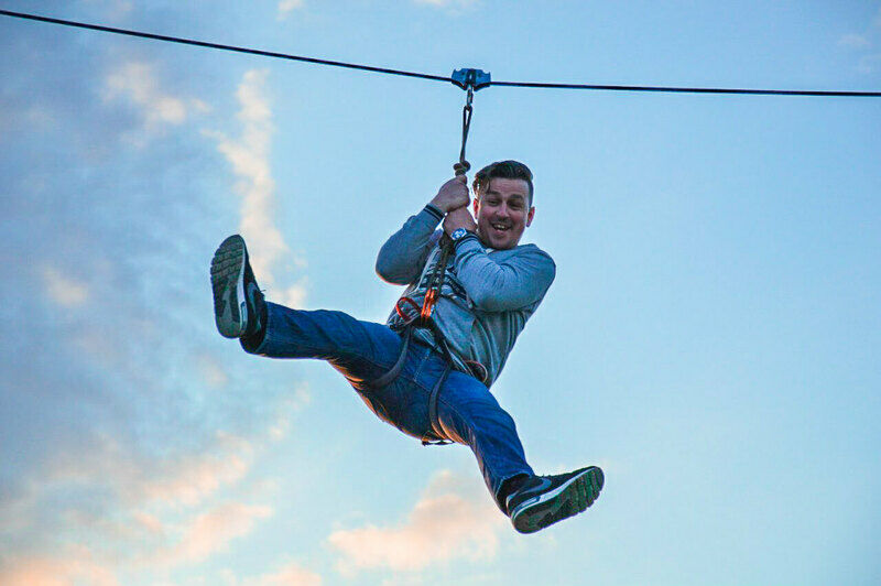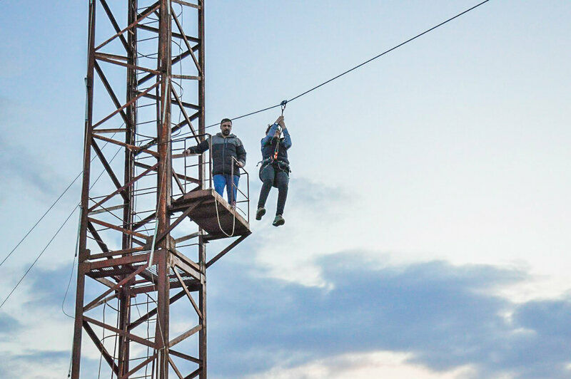 Канатная дорога состоит из натянутого на высоте троса, по которому желающие скользят при помощи прикрепленного к нему ролика. Таким образом, человек перемещается, повиснув на веревке, из одного места в другое.