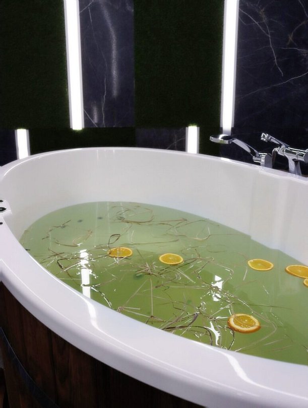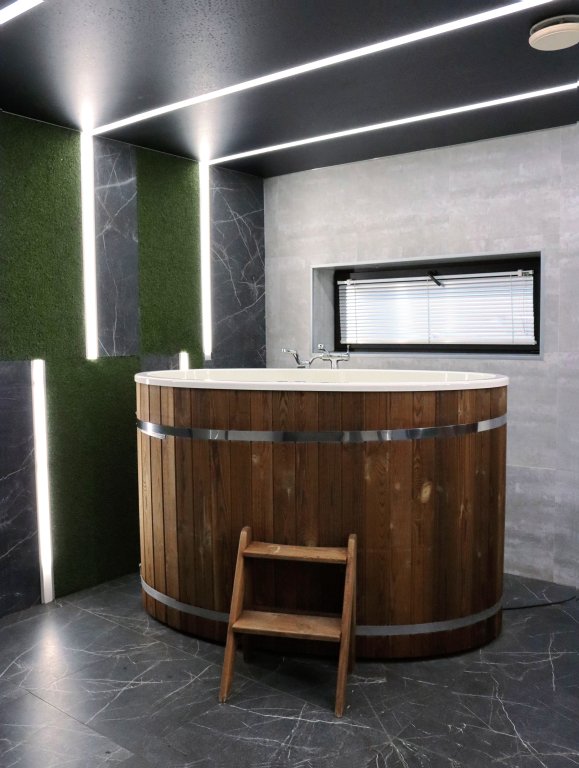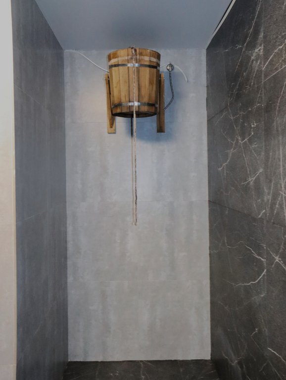 - парная, душ-ведро с леденящий водой, две кедровые бочки-купели (джакузи), раздевалки, душевые