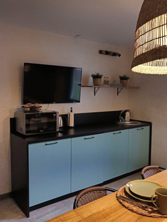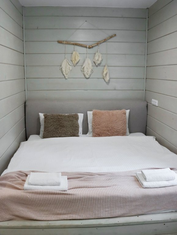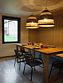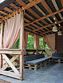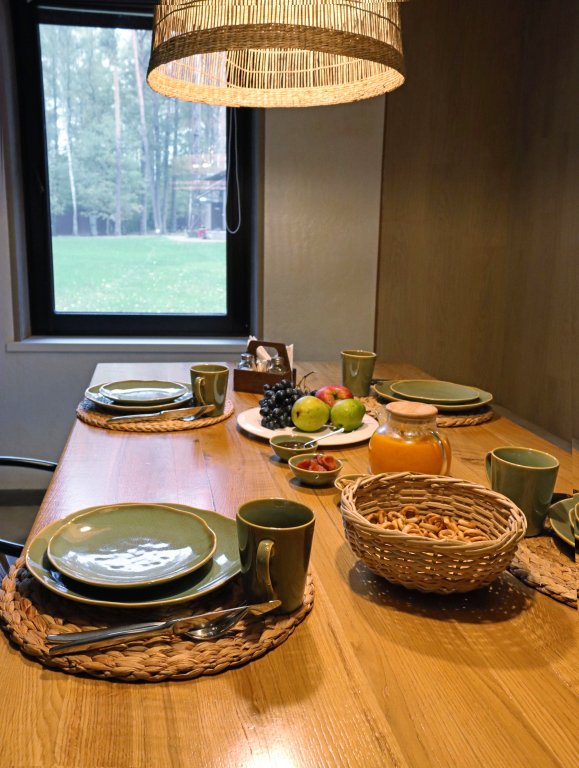 - просторная обеденная зона, оборудованная кухня, меблированная терраса с видом на лес, комната отдыха с двуспальной кроватью — здесь можно попить чай и отдохнуть в перерывах между парениями.